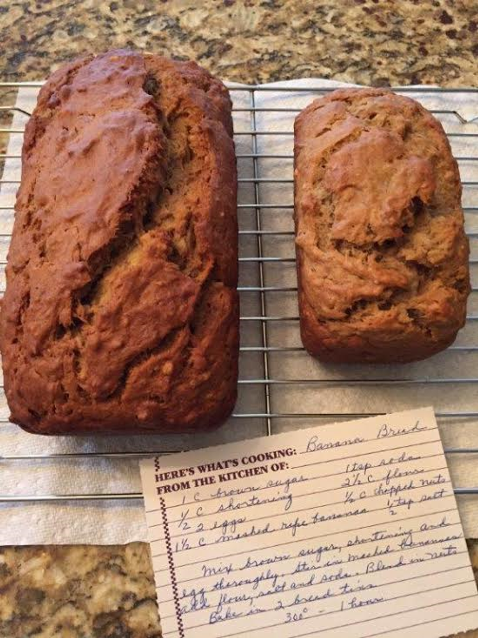 Pour and bake in one or two bread tins at 300 degrees, for approximately one hour and 20 minutes.