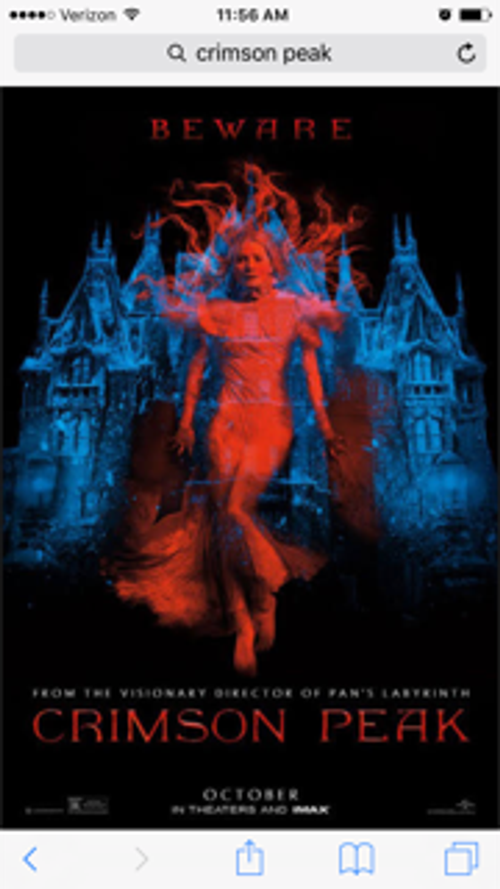 Like "The Nightmare Before Christmas," "Crimson Peak" is one of my all-time favorite movies. Edith is a beautiful young heiress from Buffalo, New York, who is on her way to becoming America’s Jane Austen, when handsome Sir Thomas Sharpe sweeps her off her feet. He takes her to his family’s dilapidated estate in England, where Thomas’s slightly unstable older sister, Lucille, also lives. Only soon Edith realizes that—you guessed it—the mansion is haunted by bloody ghosts.