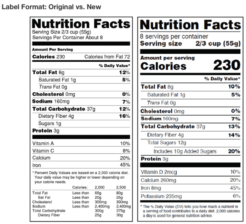 Side by side view of the current nutrition label and the modified one from the FDA's website.