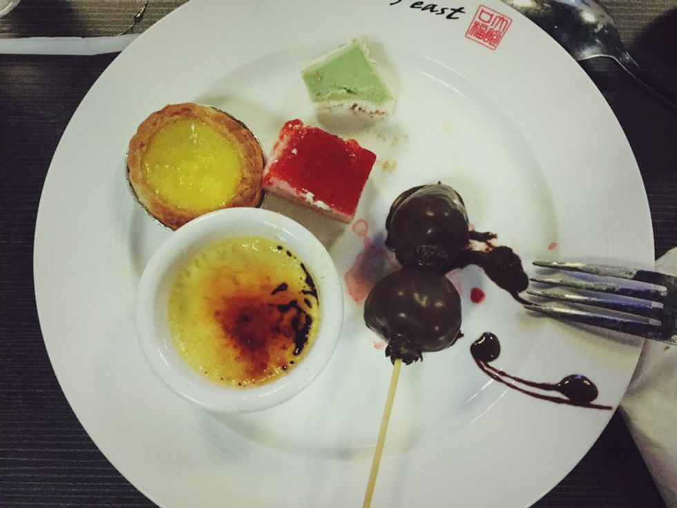I learned some people have a system to how they tackle the overwhelming assortment. My boyfriend starts with a plate of sushi, follows up with dim sum, and finishes his entrées with four to six plates of seafood. My friend Anya, on the other hand, likes to follow a pattern: A plate of hot food, a plate of chilled, repeat until satisfied, and finish with seafood. Of course there’s always room for dessert. You have a stomach for dinner and a separate stomach for dessert, right? Right.