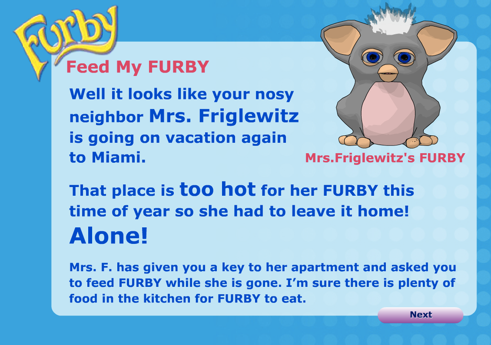 There is much to discuss here. I could dwell on the color choices that look like a middle-aged executive's idea of a "fun" website, the esoteric choices in font sizing, or the faux-3D-rendered Furby that looks ready to embrace death, if it only had arms to do so. I am not sure if Mrs. Friglewitz is an established notable figure in the Furby canon, but describing her immediately as a "nosy" individual who selfishly leaves her Furby at home while she goes to Miami "again." Mrs. Friglewitz is already painted as the villain in this unreliable narrator's tale.