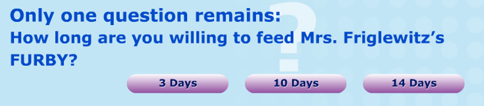 At first, I was confused as to why I, the apparently unsociable neighbor, would be determining the length of Mrs. Friglewitz's escape to the tropics, when I realized that this statement said nothing about the vacation. This Furby only survives as long as I, personally, am willing to take the time out of my busy day to feed it. My dear neighbor might be gone for months, but I could leave it on its own after three days to fend for itself in the kitchen of a suburban middle class neighborhood. Its life is in my hands and I can choose to let that life slip right through my fingers. This was the kind of responsibility I never wanted. For who would put their own desires for those of a Furby?