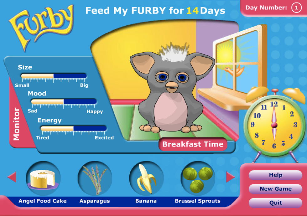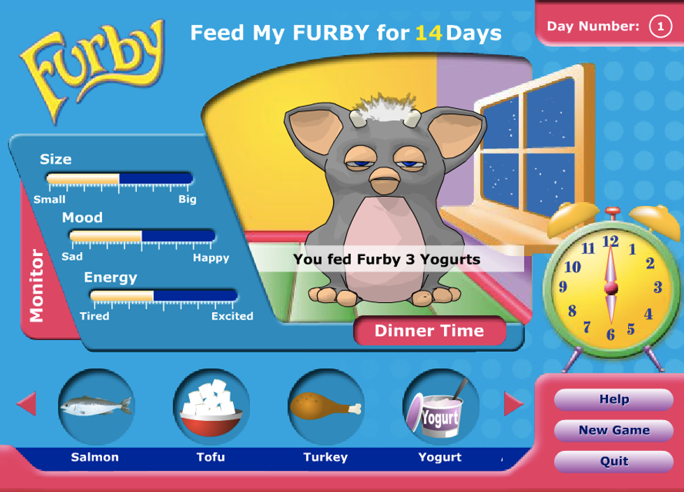 Feed My Furby was a basic pet-simulation game found on the Hasbro.com website, which in the mid-2000s was merely a poorly-maintained corporate tool, as opposed to the well-maintained corporate tool it is now. Even then, and even for what it was, the games lacked depth; the more beloved franchises like My Little Pony and Mr. Potato Head had some dress-up games or dance makers, while the less popular ones all had the same game of Memory Match-up, but with different stock images half-heartedly vectored onto the pixellated cards. Furby apparently fell into the previous category, but whoever put it there seemed reluctant to do so.