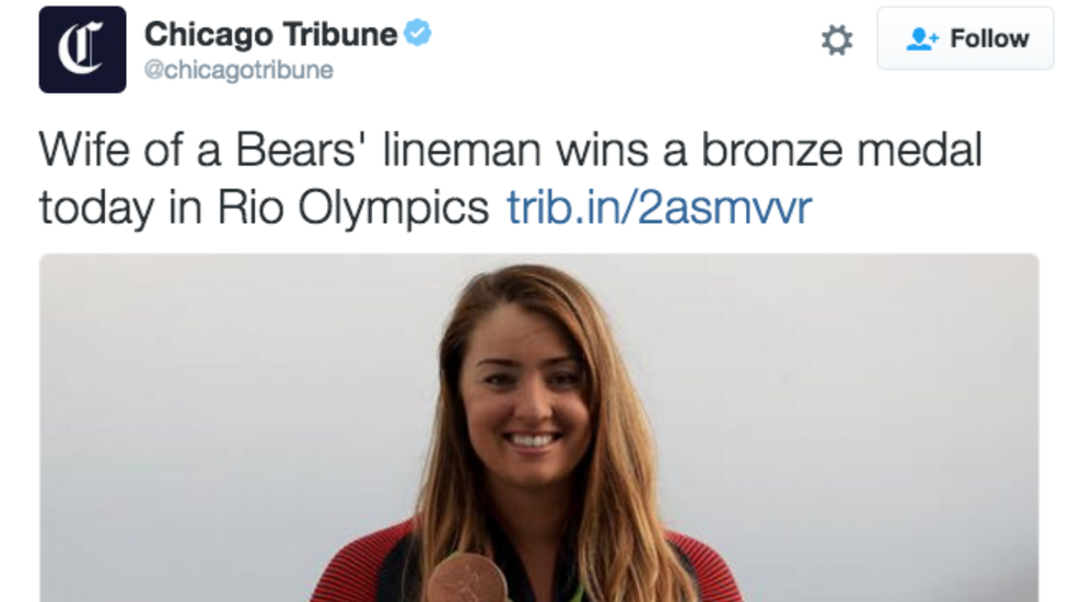 Corey won a bronze medal in trap shooting for the second time for the United States (she also won the bronze in 2008). Winning two medals in two different Olympics is an incredible accomplishment for any athlete. Her husband also happens to be Chicago Bears defensive end Mitch Unrein. When she won her medal, most of the headlines looked like the one below: