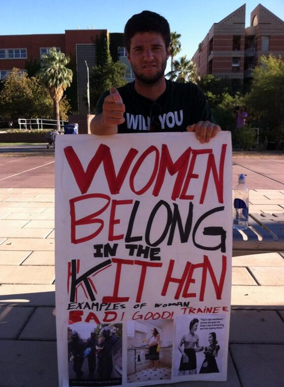 What's also bothersome to female students is that a female colleague who goes by the name "Sinless Sarah" stood by his side urging that women deserve rape. Is it ironic that this protest was the same day as Arizona's sexual assault awareness event? I don't think so.