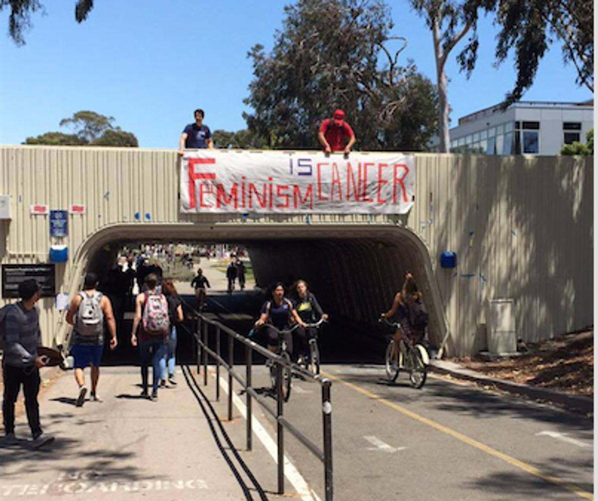On May 25, 2016, a sign was hung from the University of California Santa Barbara’s entrance that read, “Feminism is Cancer.” The sign was promoting a lecture on this topic on the UCSB campus. A week before this sign was displayed, a sorority was promoting the screening of "The Hunting Ground." "The Hunting Ground" is a documentary exposing the sexual assault statistics on college campus’s across America and how colleges were showing no help to the students who were victims of sexual assault on their campus. The UCSB sorority was receiving backlash from organizations on campus saying the documentary promotes a rape-culture in a negative way and the film had to move locations from a large lecture hall on campus to a sorority house which only allowed for a much smaller screening of the documentary.