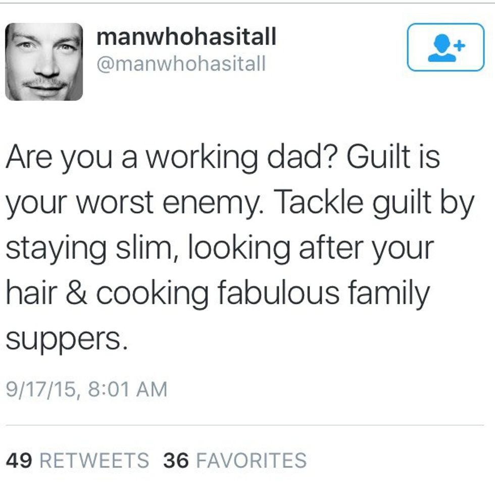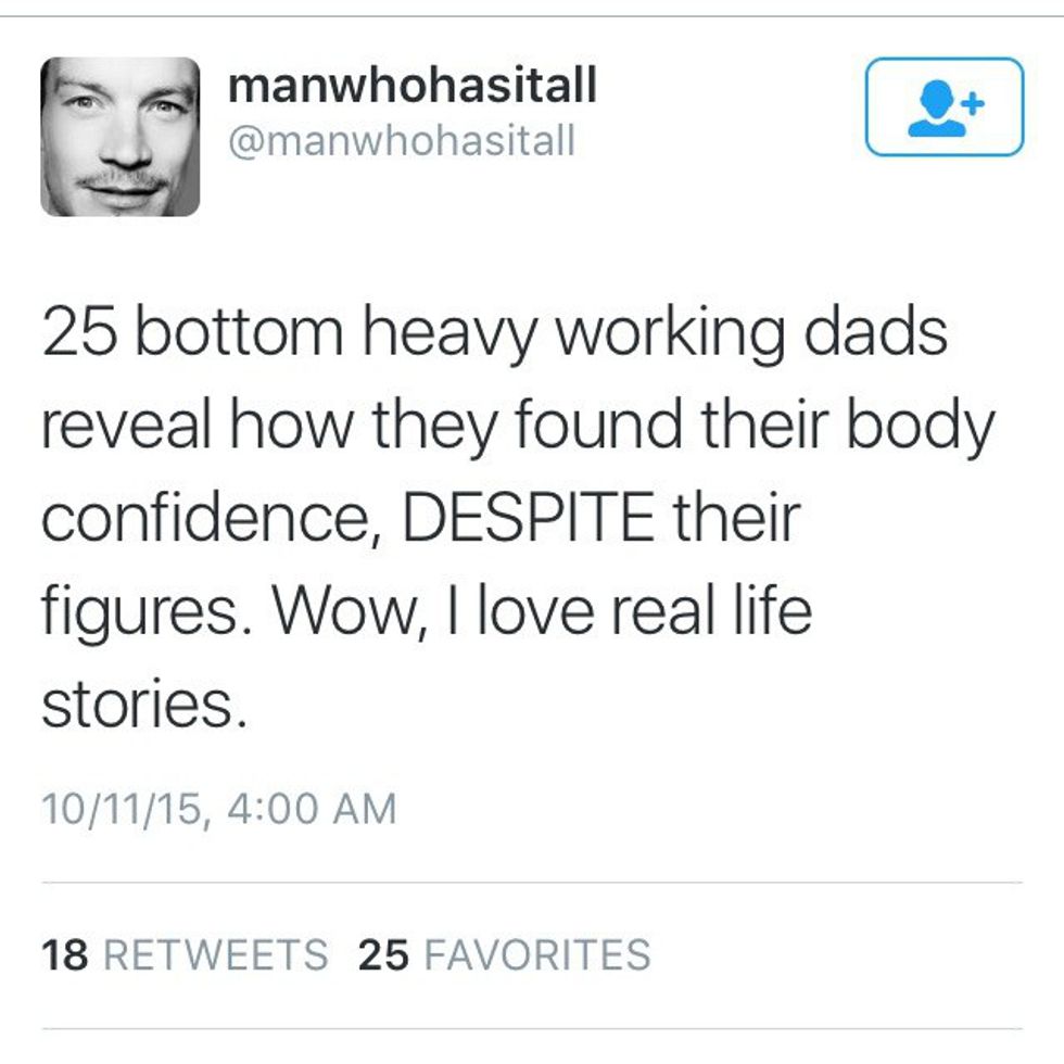 This also leads me to the point that if any of these stereotypes, ideals, and pressures that are enforced on women were flipped onto males, the outrage would be immediate and called out. That would actually be a good thing. Unfortunately, few have effectively done so as it is now and many people have even been tricked into believing it's okay. Confused about what I mean? That's okay, because Twitter user @manwhohasitall explains it much better than me in his snippets of 140 characters or less.
