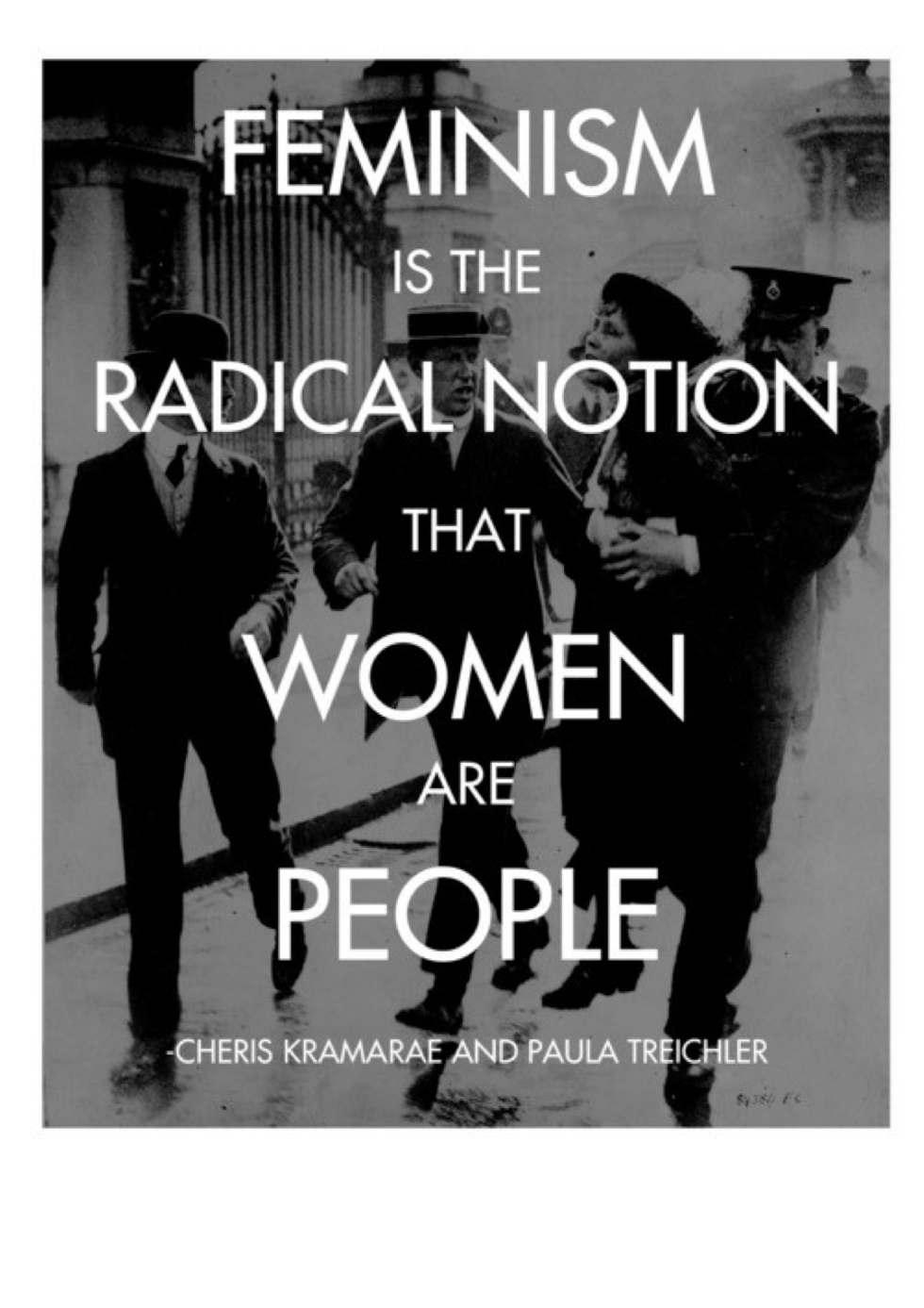 The definition of feminism is, "the advocacy of women's rights on the grounds of political, social, and economic equality to men." Not the advocacy of crushing men's rights and trying to be better than them because we have vaginas. It was only in the last century that women were allowed to vote! An undeniable human right was denied to women. Now, I'm not here to tell you what to think, but I'm pretty sure women are defined as humans...