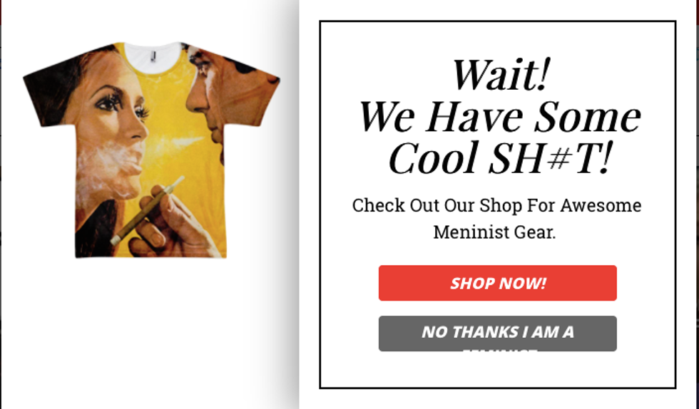 Out of curiosity, I took a look at the shop. I found exactly what I expected: clothing displaying offensive statements against women. I’m sure I would be branded a “crazy feminist” for taking offense to what they consider a harmless joke. In fact, one of the recurring jokes on their pages is about feminists who "can't take a joke" or don't understand satire. I’m okay with that though, because I don’t see being feminist as an insult. I am perfectly aware of the satirical nature, and don't get me wrong, I love a good joke. I actually enjoy reading satire, even if it goes against something I support, because I appreciate the use of humor to get a point across. But with satire there's always a point where it is no longer humorous and is instead offensive and even scary. Meninism has crossed that line.