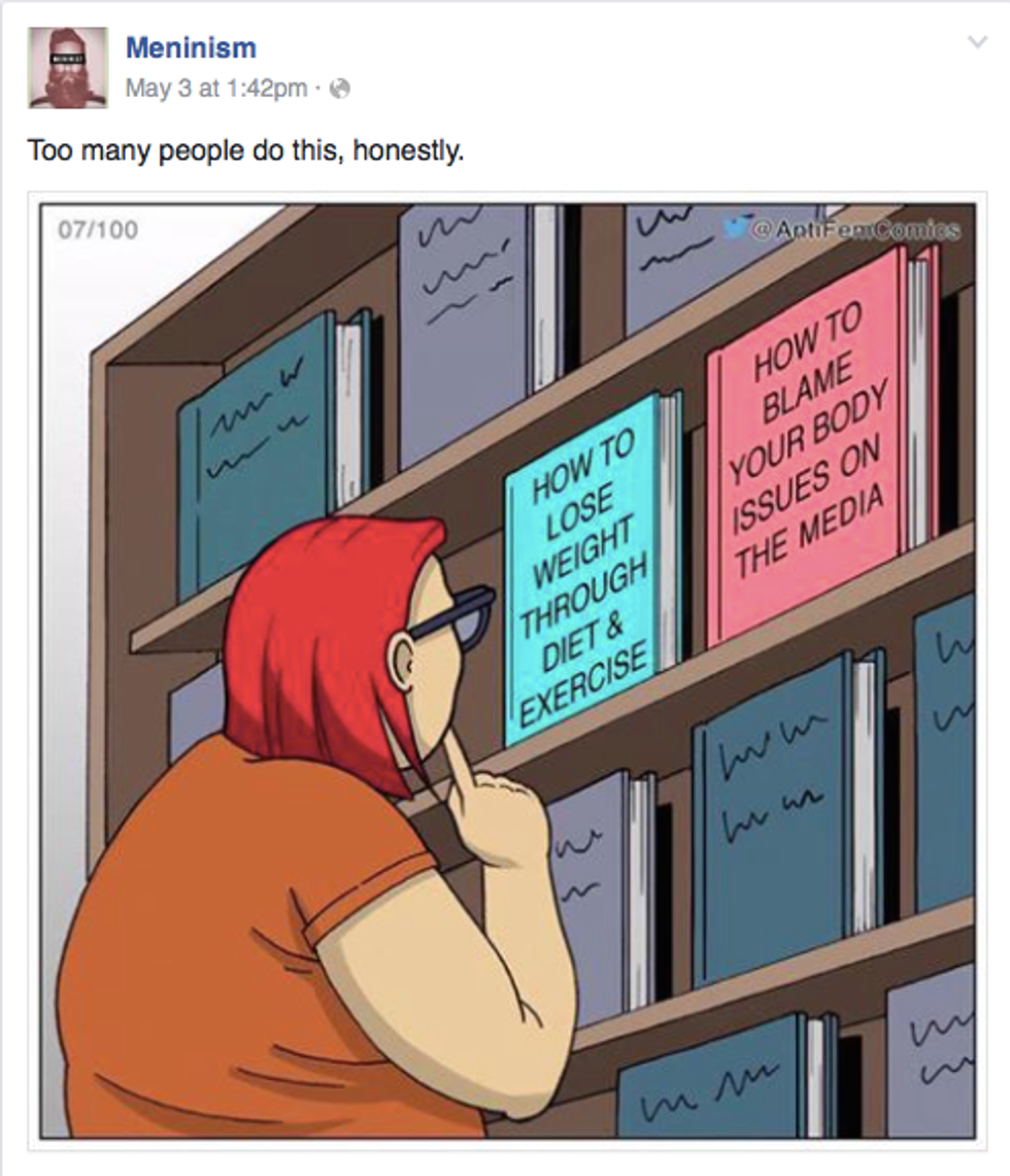 If you haven’t heard of this movement, it’s basically an anti-feminist group. They believe women are using feminism as a way to promote themselves higher than men. In response, they are trying to take these women down a notch. On Twitter “#meninism” is used for offensive remarks about women in general as well as jokes about sexual assault and double standards. Below is an example from their Facebook page.