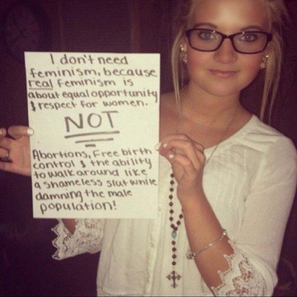 The problem I have with the image above is simple. She is stating she has a problem with feminism yet contradicts herself by stating the actual definition of feminism she agrees with, although I applaud her for actually knowing the definition. She's right. Feminism is about equality opportunity for women as men have. She then goes on to say that she does not need women going around acting shameless for having sex with different men? I won't go into great detail about the fact that she is putting several undeserving women in one category unfairly by slut shaming them, but I don't get how she is for equality and respect then says something like that. So men are allowed to sleep around and get praised for it, but when a woman does it, she is a shameless slut? Another issue I have with this picture is that she is creating an imaginary definition next to the actual definition of feminism for herself. The first sentence of her sign is stating the stereotype of feminism, not what is actually is. This is the biggest communication barrier we have with women who are actually feminists and think they aren't. She is simply saying being a feminist means you want all the men in the world to be gone, which is firstly, ridiculous, and secondly, false. Girl, you know the definition now--so apply it. We want to be looked at in the world as just as valuable as a man.