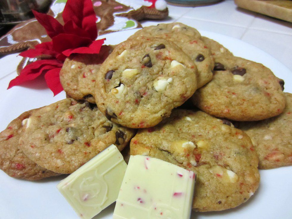 - Whisk flour, baking soda, and salt in a bowl. Beat butter, vegetable shortening, light brown sugar, and white sugar in a separate large bowl until creamy. Beat eggs, vanilla and peppermint extracts, and red food coloring into butter mixture until smooth. Gradually beat dry ingredients into wet ingredients until dough is smooth. Fold white chocolate chips and crushed candy canes into dough.