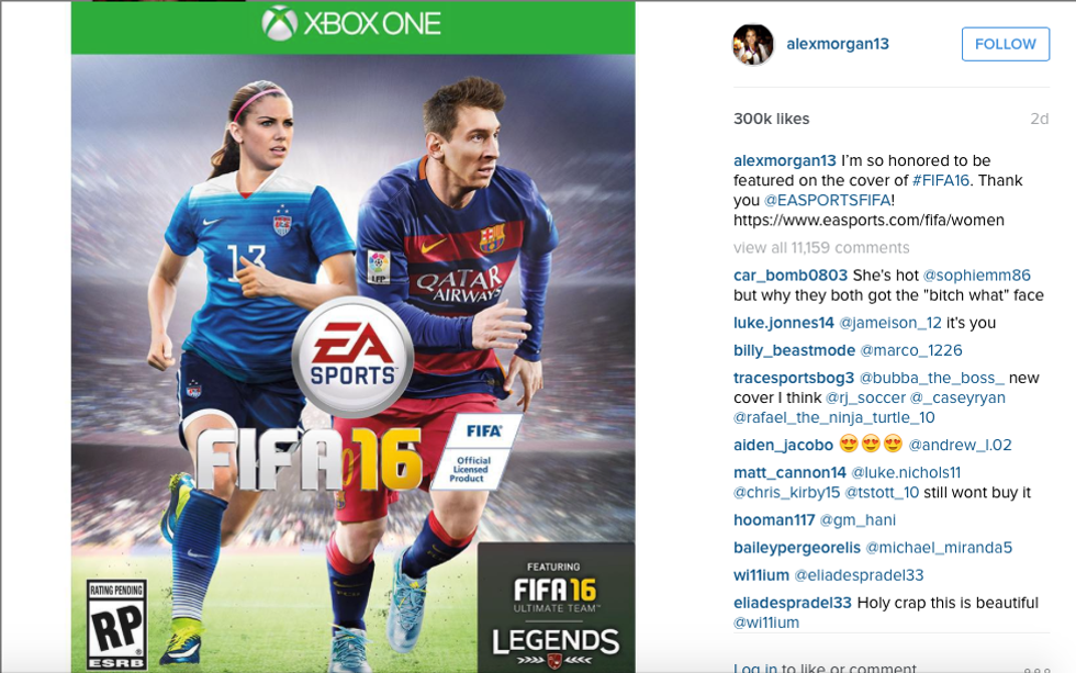 Three days ago, Alex Morgan posted the cover picture on her Instagram page with the caption, "I’m so honored to be featured on the cover of #FIFA16. Thank you @EASPORTSFIFA! https://www.easports.com/fifa/women."