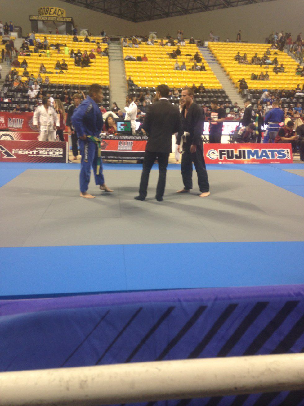 After three days of mat time, my girlfriend and I left to the World competition in Long Beach. On Saturday, I signed up and watched the other competitors. Their matches were brutal. I was in the presence of world champions. I watched their matches for hours. I could not stop moving around in my seat while knowing it would be me on center stage.