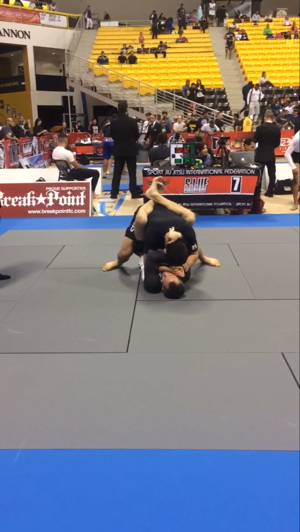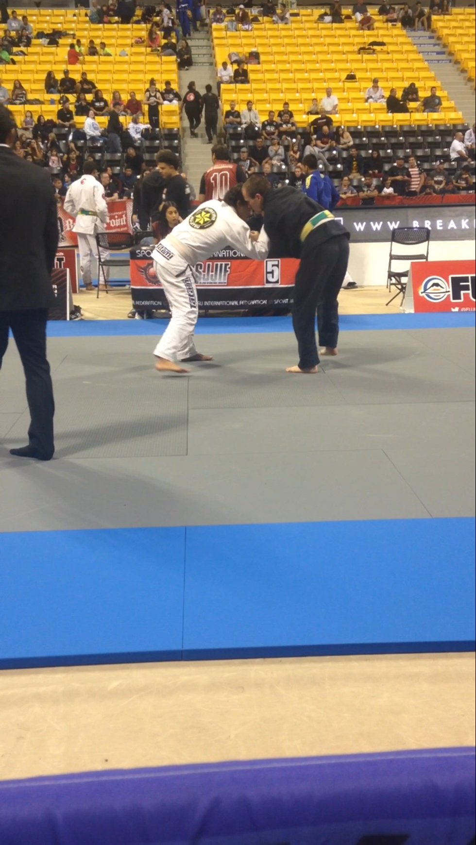 I was quickly at The Pyramid and ready for my match. This time I was not wearing my four pound Gi, but instead, I wore a light rash guard and shorts. I warmed up under the bleachers, and I soon I stood across from my opponent on the mat.