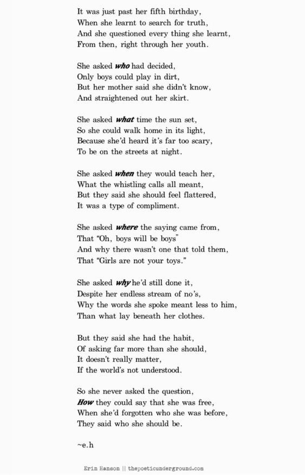 I've attached a poem from one of my favorite poets, Erin Hanson, that I hope will stir up some emotions and bring into perspective the reality of rape culture.