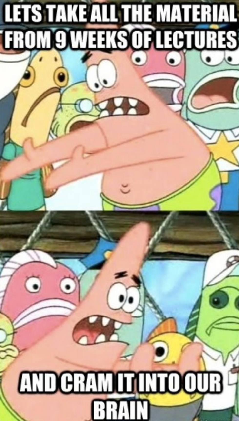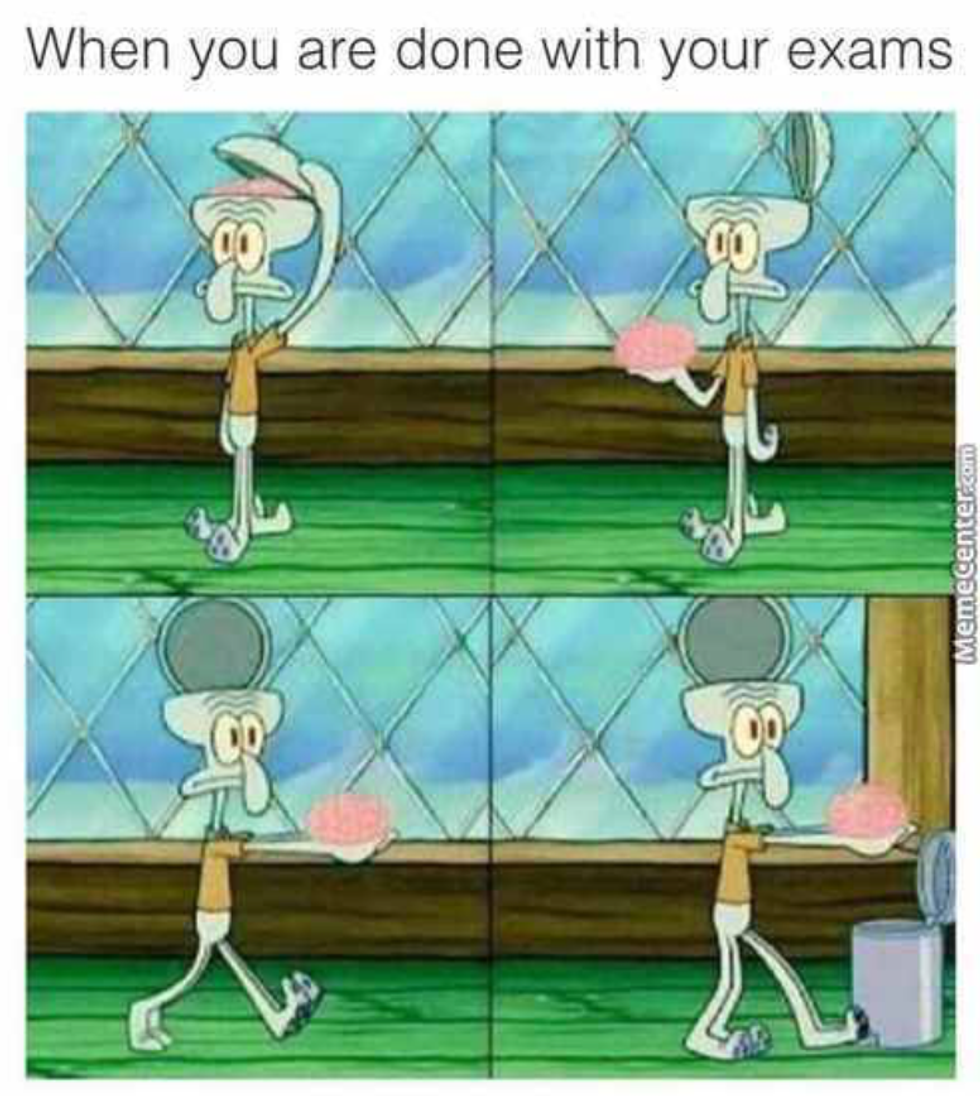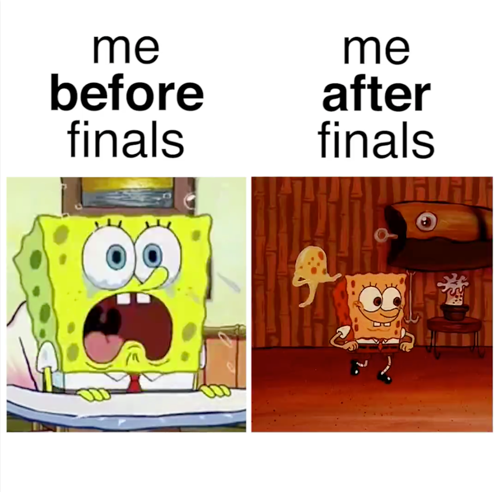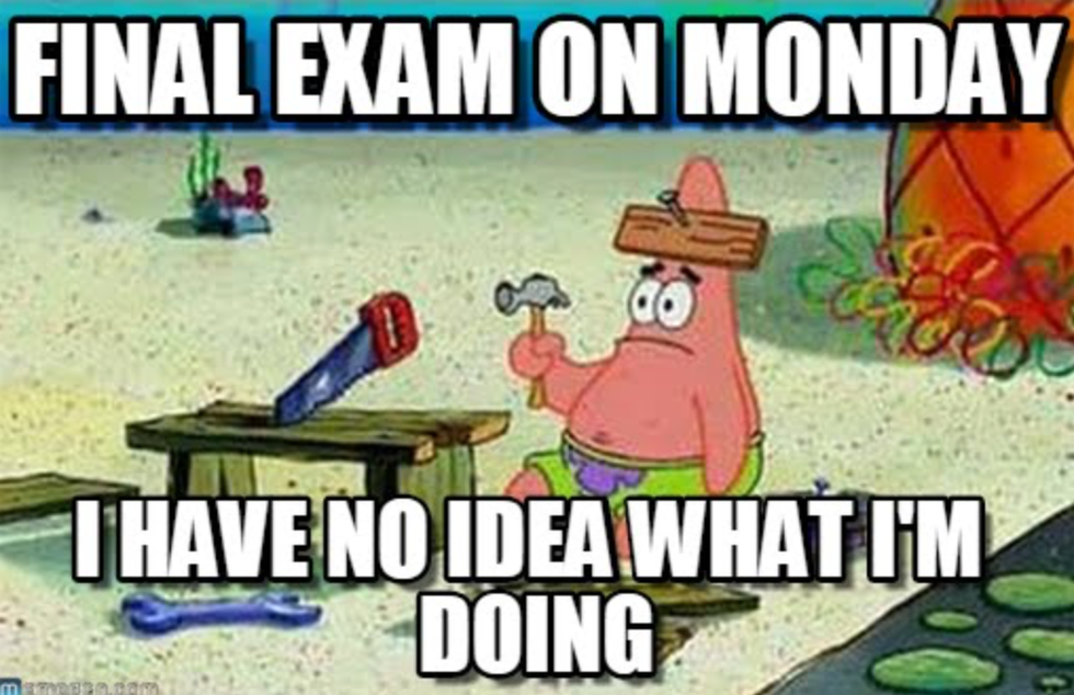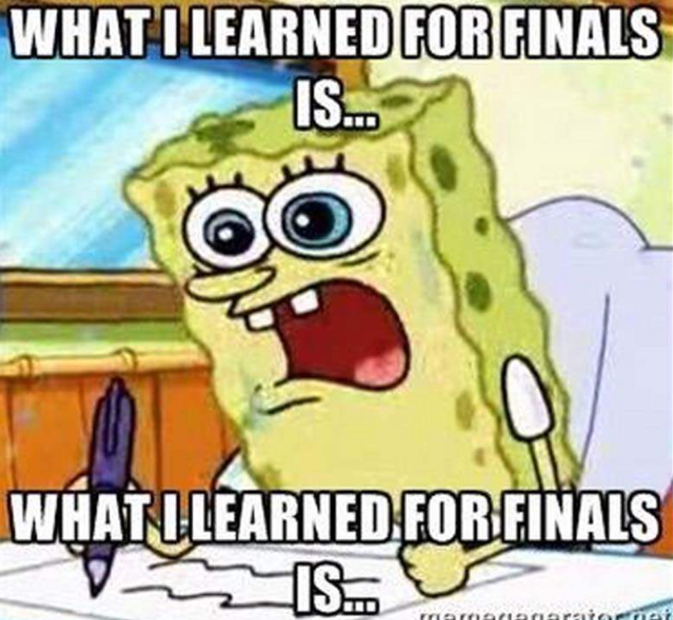 It's that time of year ladies and gentleman. *Que drum roll*... final exam week! Everyone gather your books, tissues, snacks, friends, and anything else you need that will help you not fail. I want to wish everyone luck as they try to cram in five months worth of material into their brain, all in a few days . Even if it means several all-nighters, endless tears, and over 10 cups of coffee, you can do it! As a study break, here are some memes to make you smile through the stress.
