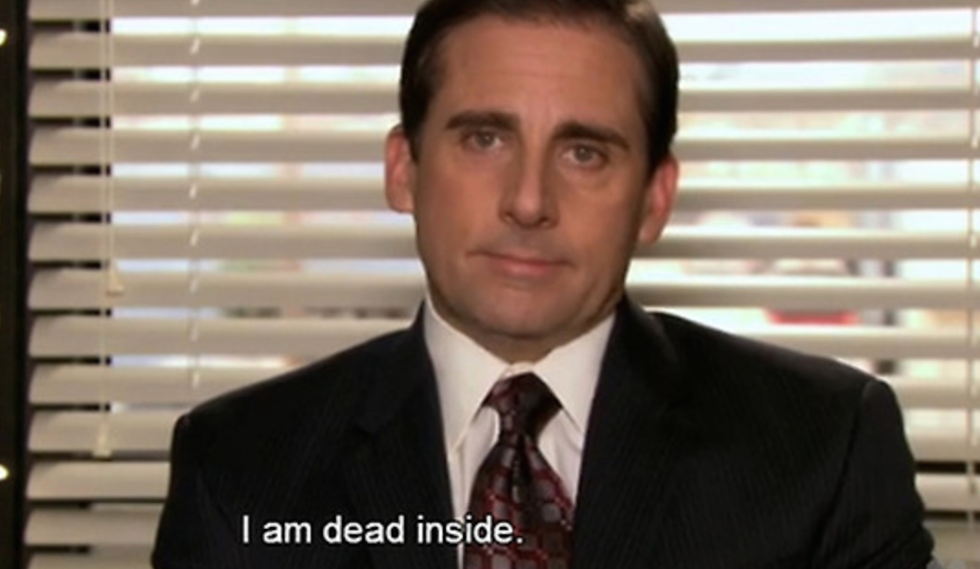 I am currently writing this article instead of doing a million other things I'm supposed to be doing. If you don't relate to that, then you are clearly not a college student during finals week. But you know who always relates to how you're feeling at any given time? "The Office." Thank you to all my favorite characters for understanding that sometimes life is like a car crash in slow motion.