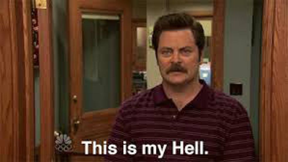 You just had Thanksgiving break and went home and stuffed your face with endless amounts of food and didn't have a care in the world. You come back to school feeling all refreshed and renewed from the break, but then you blink your eyes and it's here...FINALS WEEK. It's approaching quickly and it's not so subtle anymore. It's coming up faster than you're prepared for and it's time to start cramming all your studying into just a short week or so. There are no words to explain how terrible the feeling of finals week and all the preparation leading up to it is, so we'll let Parks and Rec do all of the explaining for us.