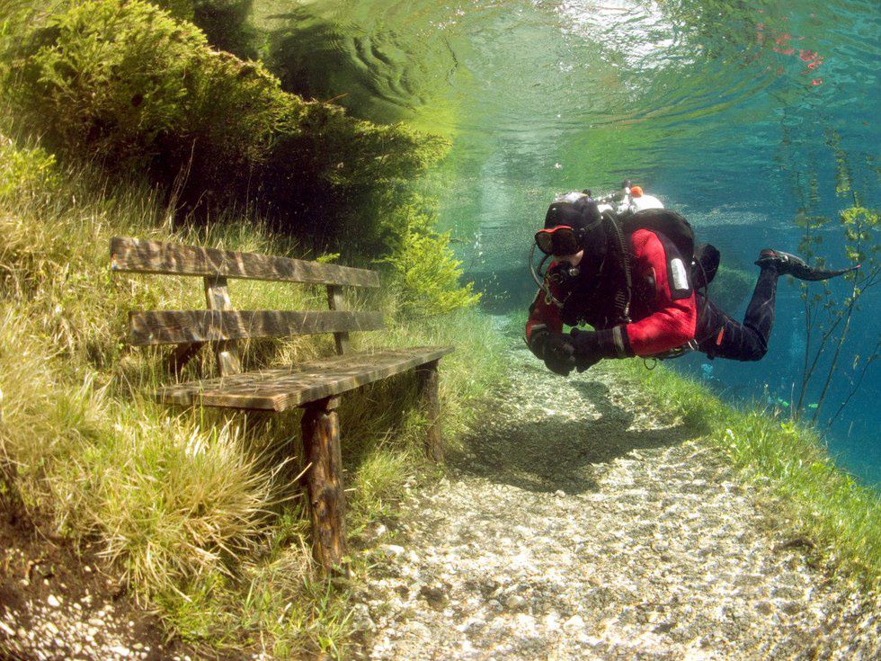 This lake is unique because it is a 40 ft deep lake in the winter and a walkable park in the summer. I'd definitely want to visit in the winter to scuba dive through benches and tree stumps.