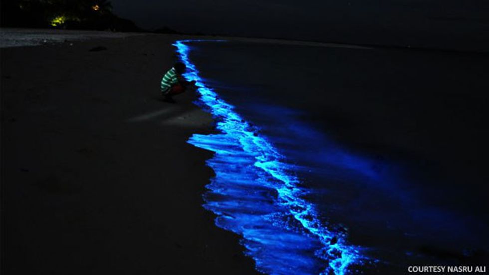 Chemicals cause plankton to glow and light up the waves on the shoreline at this beautiful beach. I can't wait to be there one day.