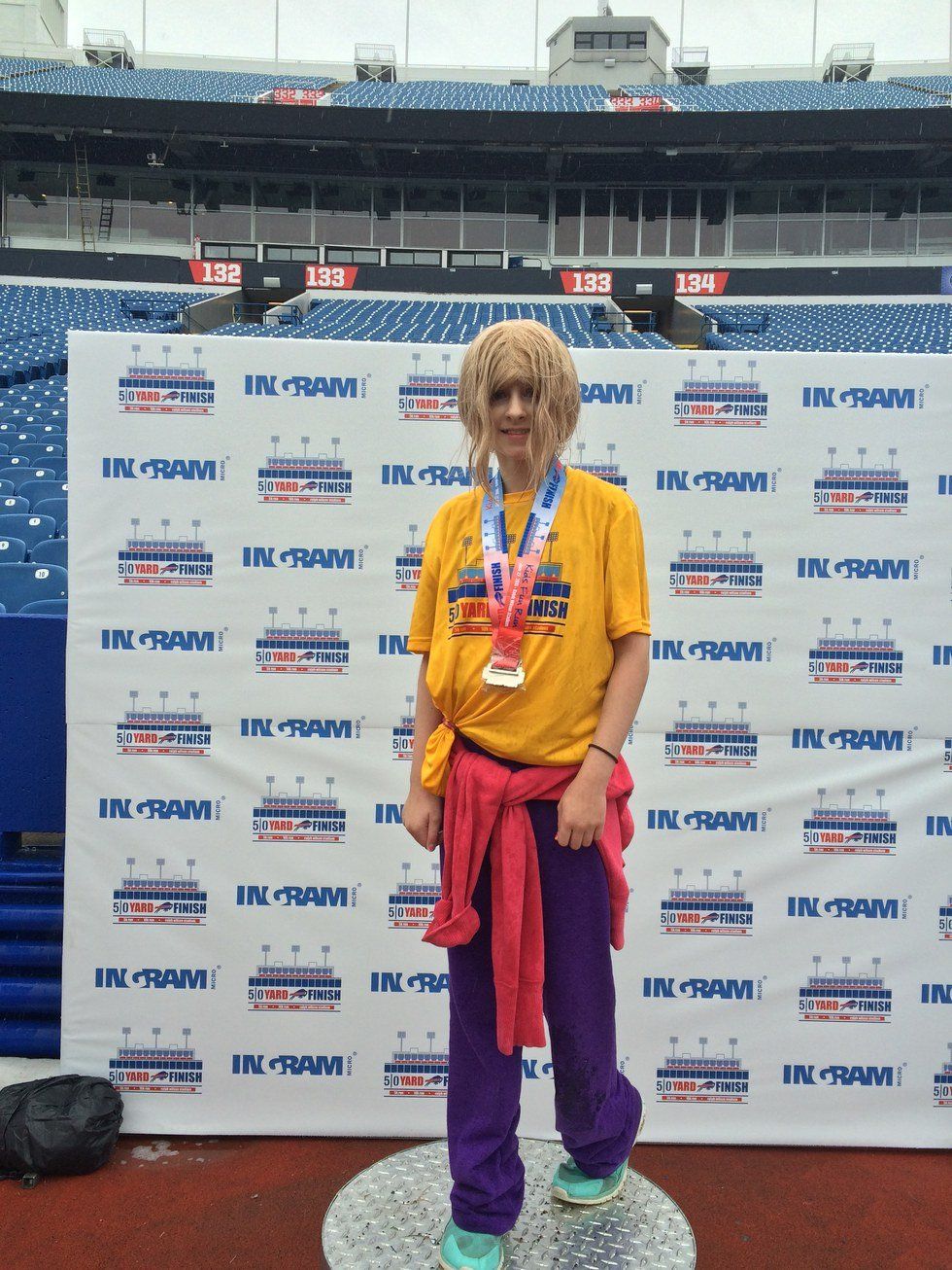 Every couple hundred meters, she had to stop and gasp for air because chemo weakens the heart and lungs. With her wig flying in all different directions, she’d lunge right on forward as soon as her breath steadied. She finished the race with a strong kick, as she powered through the tunnel where the Buffalo Bills enter the field at the beginning of every game.
