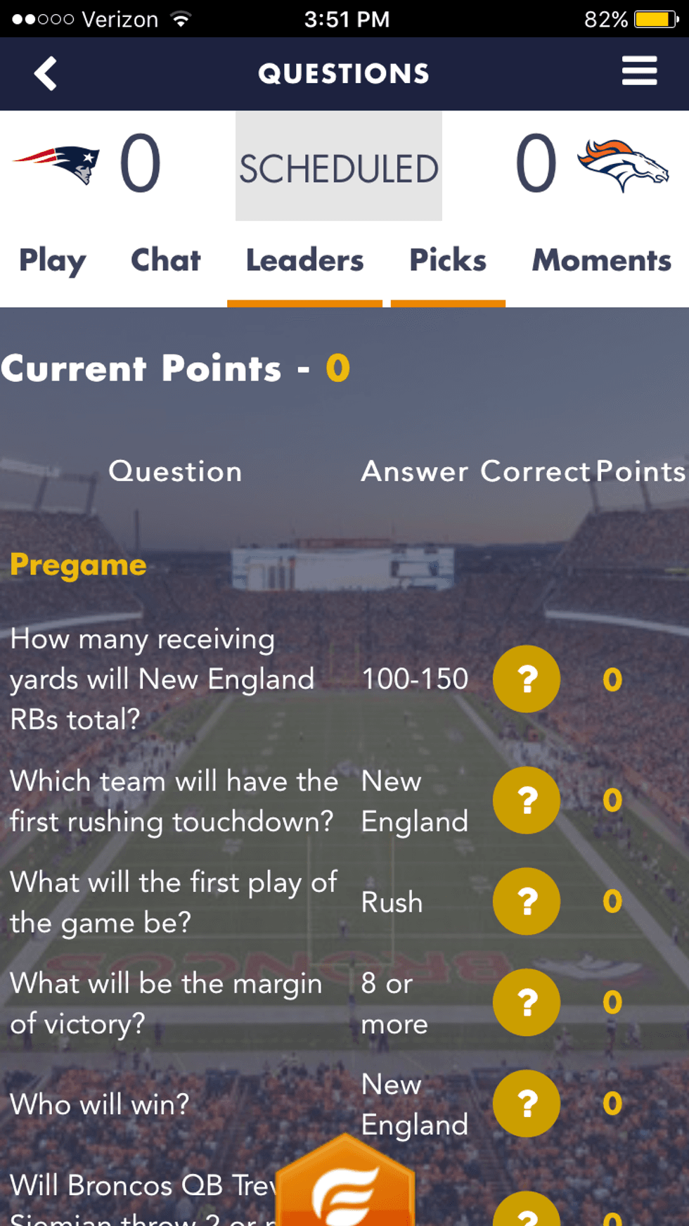 Then, throughout the game, the app will ask you more questions. For football games, it is every drive when new picks are available. At the start of every drive, you will be asked questions such as "will a tight end catch a pass for more than 10 yards?" or "what will the first play of the drive be?".
