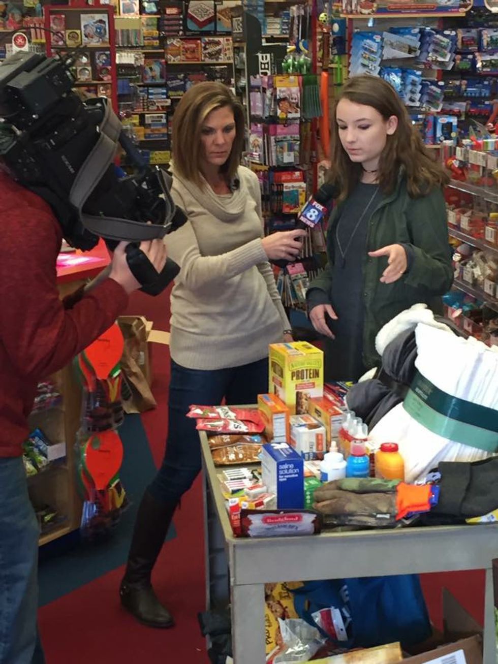 From that point I was obsessed with the idea of helping these men and women who were spending their nights and days to help us.I went online and researched more specifics about the fires, where they are and what the firefighters need. I found a list and posted it on my social media and began handing out flyers. I got an overwhelmingly positive response. Day one I had a huge box of cough drops, Advil, eye drops, nasal spray and socks dropped of at my drop off location, Toys & Co in Friendly Shopping Center. We decided to take the supplies up to the mountains on Wednesday, November 23rd, That was only six days to collect supplies. Nobody thought it was possible! Boy did we prove them wrong! Saturday I handed out flyers around Friendly Shopping Center and asked many businesses if I could put posters in their windows. Sunday night I posted a Twitter video explaining the project to my friends and followers. Monday with only three days to go I handed out flyers at school. Tuesday morning I was able to share my project on the local news station Fox 8 News, then received two bags of supplies when I got to school.