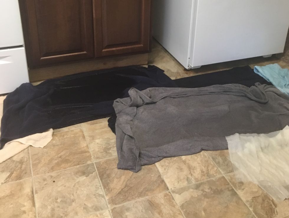 So I head home. Walking up to my front door was the awful start. A pool of 3-4 inches of water blocking the door. So I started scooping the water up with a salad bowl and throwing it into the grass. About 30 minutes later, I was finally able to go inside. I found my roommate trying to soak up all the water that was coming from our floor baseboards, with towels. A friend came over and we started ringing out the towels to get rid of the water. Finally, our landlord answered the phone and had someone bring a shopvac over to suck up the water. This bucket held 12 gallons of water. It took 3 full buckets to clear out the front entry way. As we would get the water cleaned up in our kitchen and closet, the front door drain just kept pushing water up. Our upstairs neighbors were kind and helped us by clearing the gutters and digging a water channel in the backyard, away from the house. As all of this was going on, it was still pouring rain, and snowing. We were vacuuming water for 6 hours before our landlord came and took over.