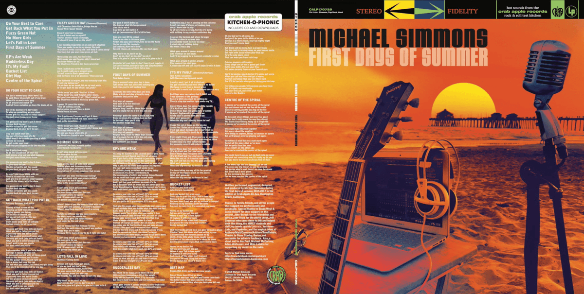 "First Days of Summer" has three themes: songwriting, mid-life romance, and death. It is printed on vinyl with six songs on each side, however other formats of download and consumption are available. Simmons remarked that he did his best to put this album down, and all that he asks is, like the first song off his album says, "do your best to care."