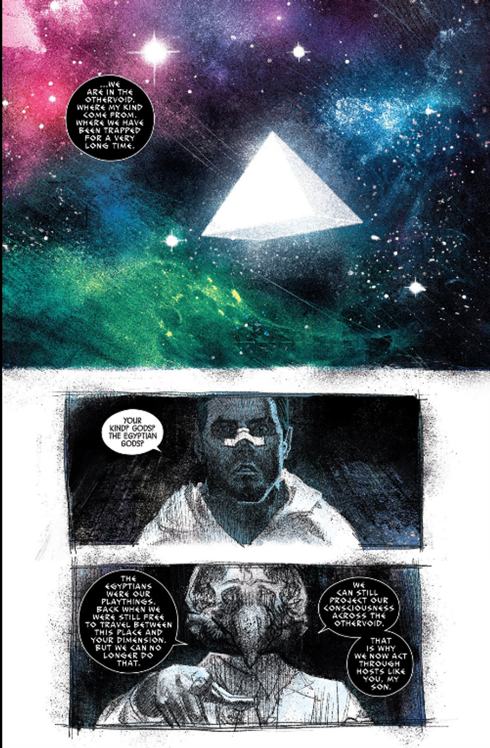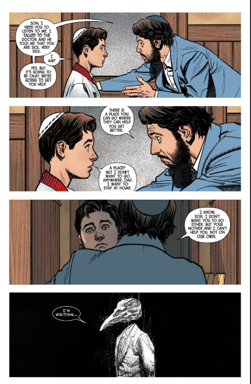 Yes. Marc's childhood. Some stories, such as Shadowland: Moon Knight, managed to include an excerpt from the early years of Marc Spector, his relationship with his brother and father, and how that tied into his position as a crime fighter, but much is not known about how Marc's life was prior to his days as Moon Knight. In Lemire's run, we learn that, perhaps, Marc has been struggling, mentally, since childhood. Without spoiling much, Marc is confronted by his father (seen above) about some peculiar behavior Marc has doing. Earlier in the series, Marc is told he has been in Asylum for years, and that he made up Moon Knight, drawing sketches and pictures of him and his various tools. This new insight into his childhood runs parallel to the continuing story of Marc, in the present, trying to gather his friends and loved ones, and try and re-establish peace, whatever that means. As with the previous books in the series, the new arc looks gorgeous.