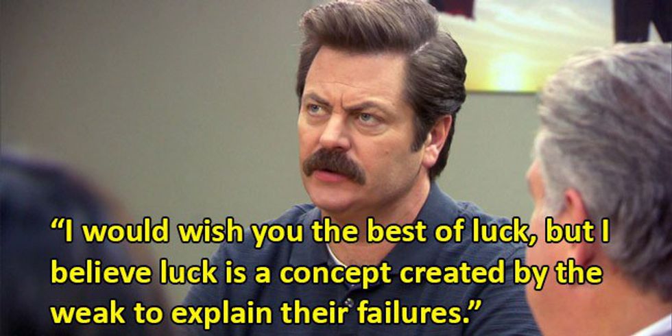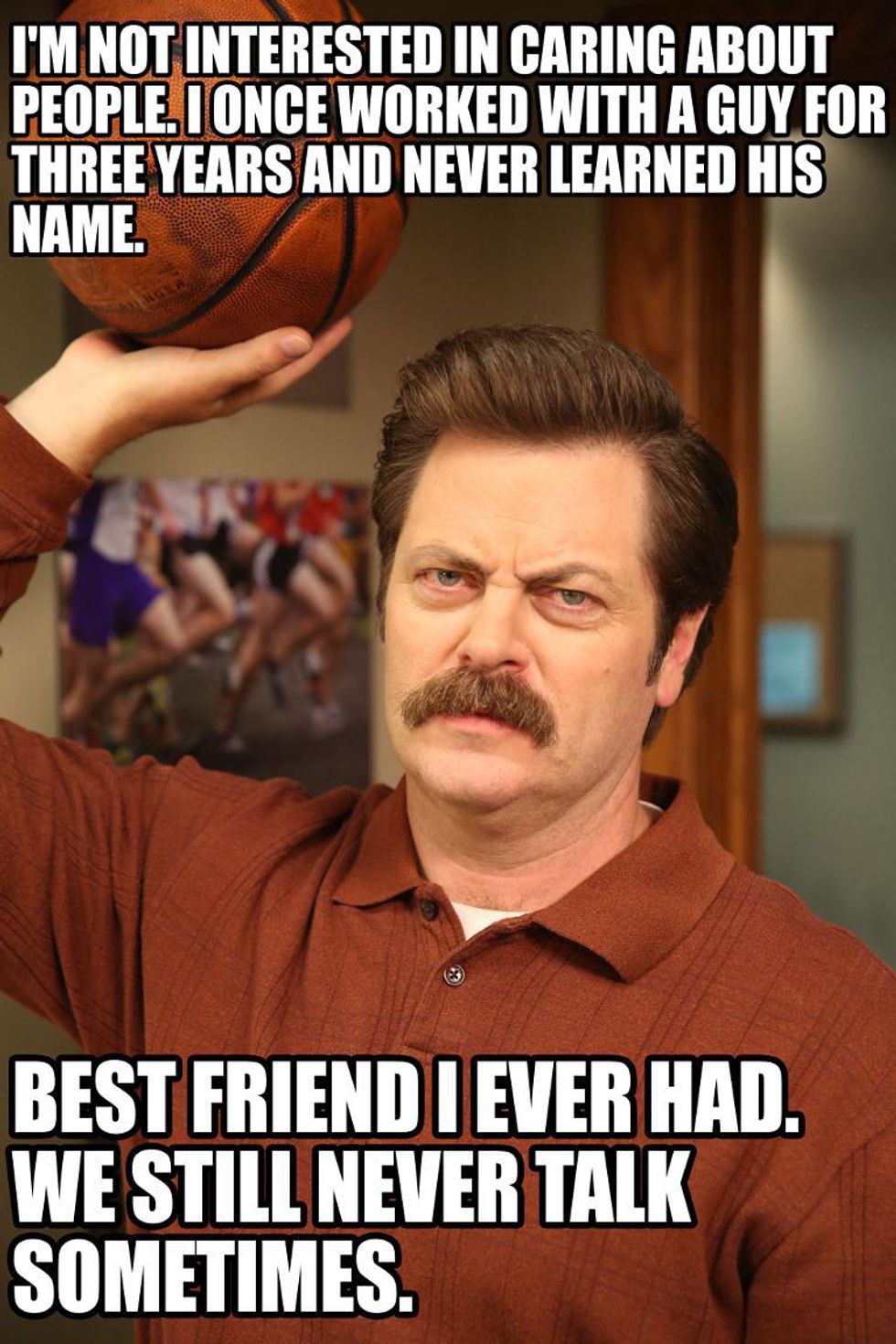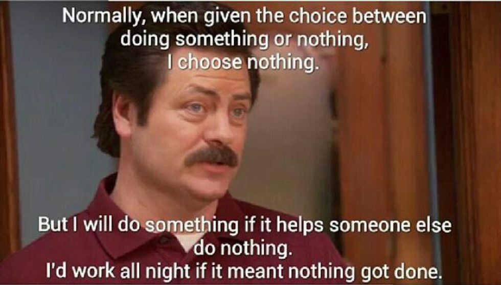 The first week of college is a week of ups and downs, and a lot of out with the old in with the new. This week will test your strengths and maybe even your weaknesses. Luckily, Ron Swanson doesn't have any weaknesses, but he perfectly understands what you went through/are going through at this time in your life.