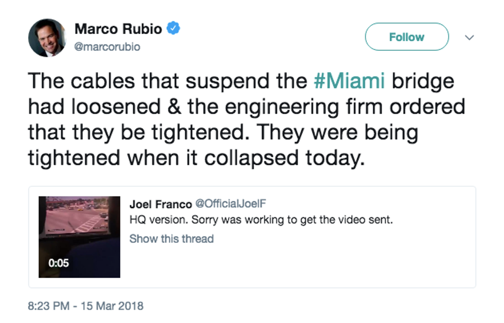 Sen. Marco Rubio (R-Fla.) tweeted late Thursday night that the suspension cables on the bridge were being tightened when the collapse occurred.