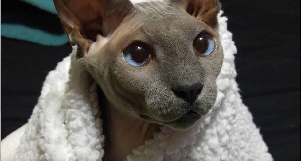 Despite not having any fur to groom, these wrinkly babies still require a unique level of maintenance. The access buildup of skin oils that would normally be absorbed by a cat's coat can become a problem for Sphynx kitties, and as such means weekly or bi-weekly baths are required to keep these kitties healthy. They can also be prone to skin cancer from sun exposure, and many Sphynx owners recommend special kitty sunscreen to keep them from getting a little too toasty. They also need sweaters in the winter, and if that's not just the cutest goddamn thing, then I don't know what to tell you.