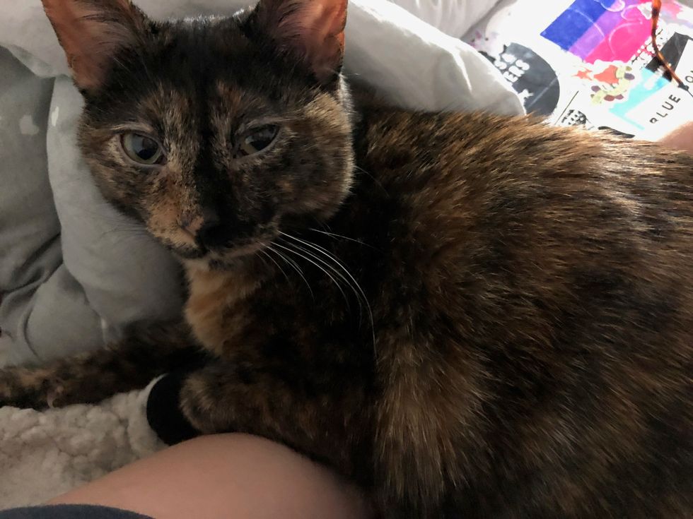 Her favorite pastimes are destroying posters I like and sleeping in places she should be physically unable to fit. Also eating weird things off the floor and spontaneously appearing in places she shouldn't be, like bathtubs.