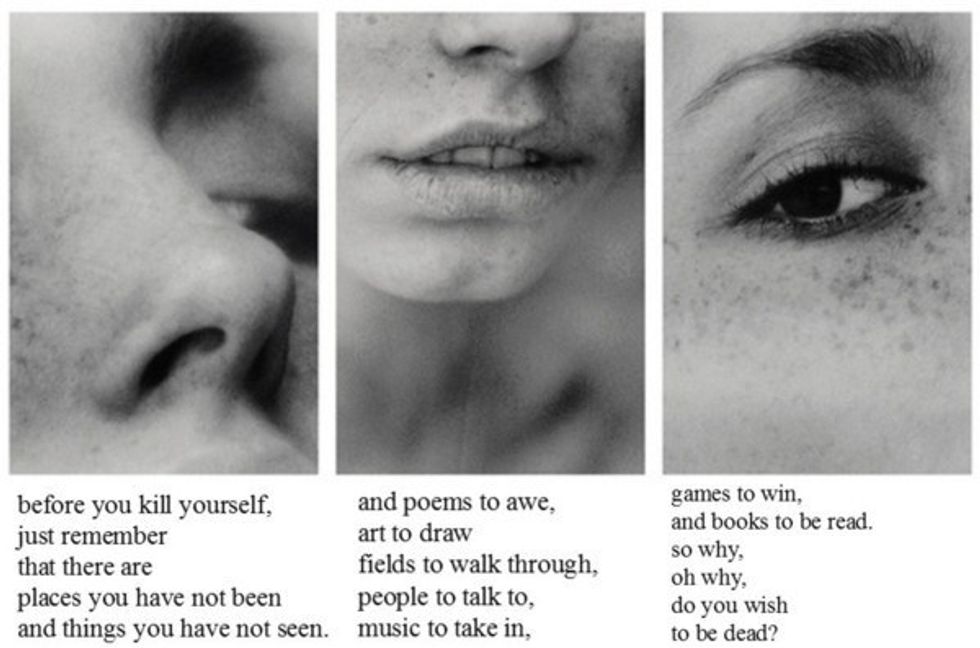 Life is hard. It sucks, and it can feel impossible. Sometimes it will feel like a giant mess that just keeps getting bigger and bigger. I know what that feels like and I am also very lucky to be able to understand that life is not always like that. Life can be amazing, it can be light and fun and happy. Life can mean freedom, freedom to smile and laugh at everything. Life is light and hopeful. It is depression that weighs it down and is all consuming. We all need a reason to not give up, to keep fighting. If you or someone you know is suffering from depression do not be afraid to talk to someone. Talk to a trusted adult, parent, teacher, visit your doctor or if the situation is grave go to your closest emergency room and speak to the crisis team. It is worth it and you are worth it.
