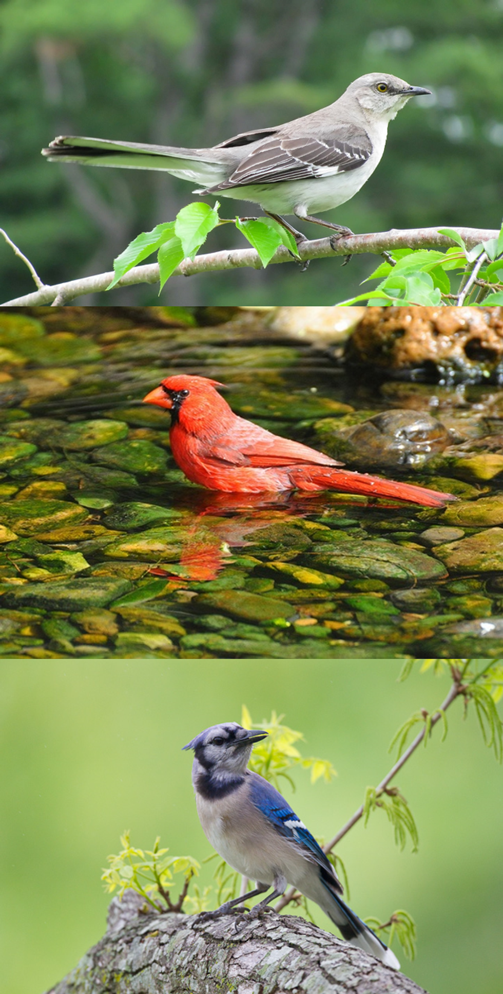 (Top: Northern Mockingbird Middle: Northern Cardinal Bottom: Blue Jay)