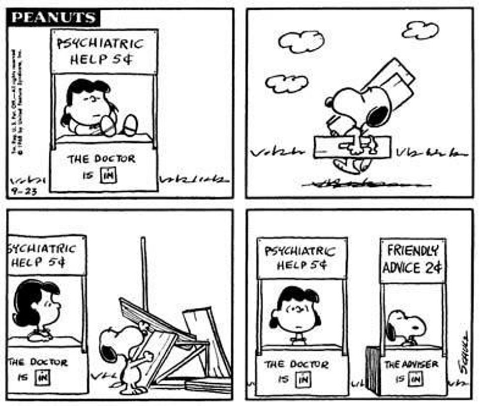 Finally seek help for any academic or personal problems you may have during the semester. Talk to your professors if you fall behind in class or don't understand a concept. If you struggle with anxiety or depression or any other mental health difficulty, try to seek out counseling services on campus. Find someone who will actually offer constructive, helpful advice, don't choose a "Lucy-type" counselor who only cares about money, find someone who cares about YOU. Your mental and physical health should be your number one priority. No grade is worth compromised health. If you're too sick to focus or contribute in class, stay home and go to the doctor. It is vital for the health, safety, and effectiveness of the class that you take responsibility for your well-being. Everyone, and I mean everyone, is vital to the success of a class; therefore, we need everyone in prime condition.