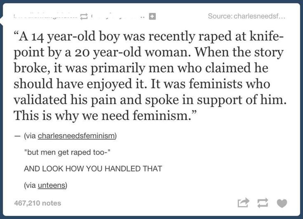 On issues ranging from rape, abortion, sexuality liberation, parental rights, male reproductive health, mere stereotypical gender roles, . . . and the list goes on and on. Female feminists and feminism as a whole has worked too for men in every way shape and form; even despite the continual lack of coverage and slanderous accusations of misandry . . . and . . . I am just done you guys, here, https://mic.com/articles/88277/23-ways-feminism-ha... read this other list too for more reasons. So now can we ALL be done with this collectively misinformed promulgating of misinformation??? PuhhhhLEEEEEEEAAAASSSSSEEEEE?????