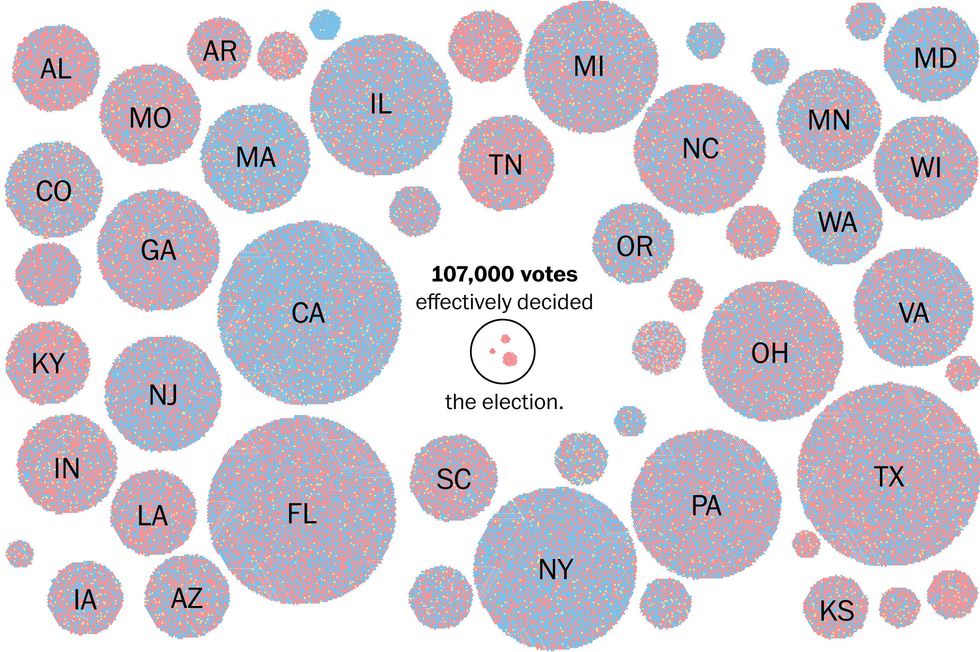 The impact of the electoral college means each presidential election comes down to just a few key swing states. A popular argument in favor of the electoral college is it gives more of a voice to rural America, and that the big cities should not get to choose a president for the entirety of the nation, since what rural areas need is very different from what urban areas need. This is true; without the electoral college, candidates would have no reason to campaign in rural areas or give any thought to them in making policy proposals. But the reverse is also true. With the electoral college, rural America, specifically a handful of swing states, chooses the president. Why should people in those few states get to decide who runs the entire country? The most reasonable thing to do is to amend the electoral college. Instead of basing the number of electoral votes on the House of Representatives, have an equal population-to-elector ratio in each state. Modify the winner-takes-all system to model the system in Maine and Nebraska, where a certain portion of their electoral votes are given to the candidate who wins the statewide popular vote and the remainder of the votes are given proportionally. This way, rural Republican areas in traditionally Democratic states, such as northern California, or urban Democratic areas in traditionally Republican states, such as big cities in Texas, will all have their voices heard, without alienating any sector of the country, and the majority of the nation will pick the president.