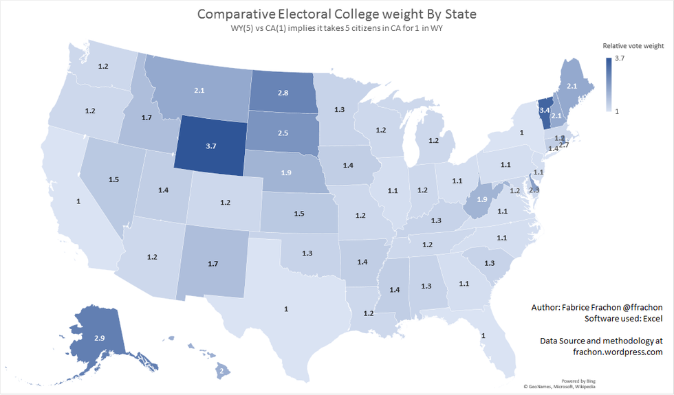 Not only is the system itself rigged, but it is now incapable of fixing itself. The winner-takes-all system would have much less of an impact if electoral votes were appropriated proportionally. However, many smaller states have a lower population-to-elector ratio, meaning each person's vote has more value. In the states that have the most electoral votes, like California, Texas, New York and Florida, there is a disproportionately high population-to-elector ratio – there is only one elector for every 650,000 people. Meanwhile, states like Wyoming, Vermont and North Dakota may only have three or four electoral votes, but they have one elector for about every 200,000 people – so if you live in Wyoming, your vote counts nearly four times as much as someone living in California. It may seem like a relatively easy fix to just have an equal population-to-elector ratio in each state, but the number of electoral votes is determined by a state's number of House representatives, and a constitutional amendment in 1929 capped the total number of representatives at 435. Without a state's number of representatives being able to increase with the growing population, their electoral votes also will not increase proportionally. The allocation of electoral votes is updated every ten years with the census, but the total number of electoral votes does not change; votes are shifted from states with the least population growth or net loss to states with the most growth. However, this reallocation does not completely account for all population growth. As long as the number of House representatives is capped at 435, electoral votes will never be equally weighted among states.