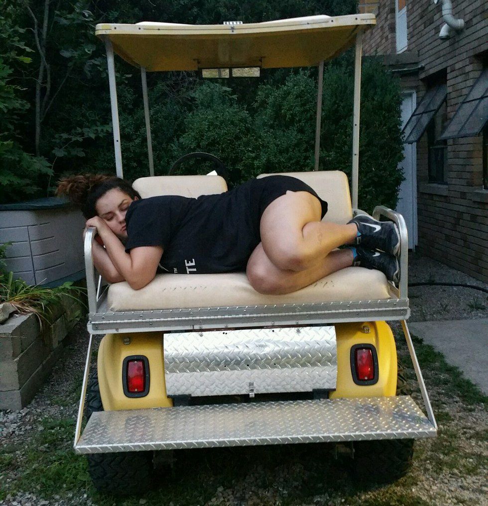 Anywhere I could find a place to nap, I would. The golf cart doubled as my bed and one of my escapes throughout the summer. When I would get annoyed with my dad (because no offense, I never thought I would be so needed at the house while I was taking a summer class and working part-time), I would take the golf cart and speed around the driveway. My mom said she always heard the wicked witch music in her head when I would speed around. At least I didn't crash our golf cart into a tree (you will understand this statement later).