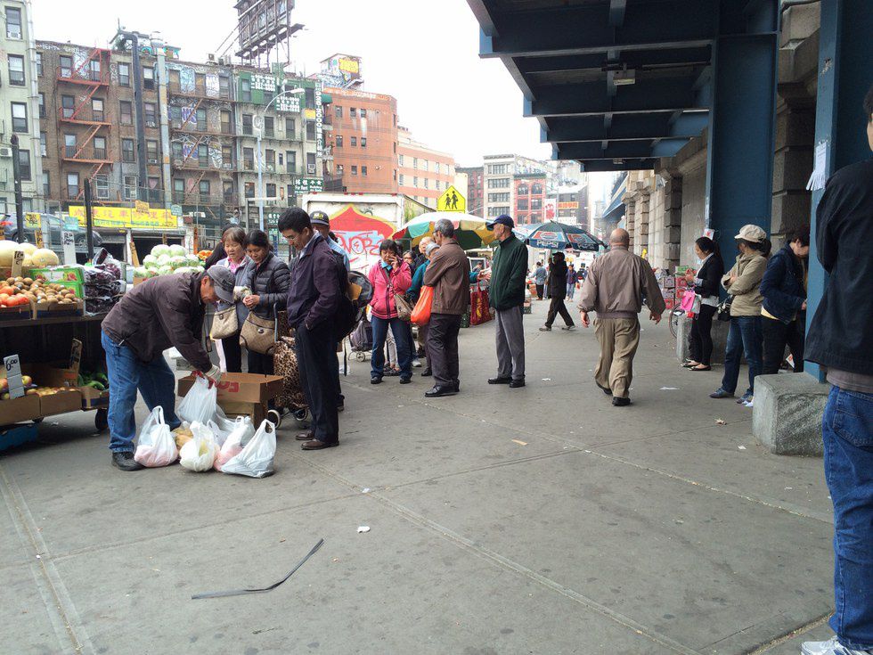 I was “grocery shopping” with my 62-year-old aunt, who lives in Chinatown now with her son, his wife and their two elementary-age children on Eldridge Street. Out of the 15 or 20 vendors who dot the wide sidewalk of Forsyth Street, competing for a couple of dollar bills at a time, I can only decipher these two particular vendors’ words.
