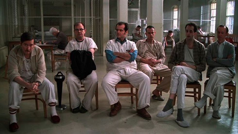 One Flew Over the Cuckoo’s Nest is riddle in of itself. A possible way of thinking about this epigraph is to understand how the characters compare to the geese. Some fly east, and some fly west, going in opposite directions leaves them against each other. This is a depiction of the inmates verses Big Nurse and her machine parts. The goose that flies over the cuckoo’s nest would be McMurphy, because he’s the one who ends up crazy in the end because of his lobotomy. Chief is the one goose who escapes and is plucked from the "cuckoo’s nest," or the asylum. Moreover, both the novel and the film adaptation of One Flew Over the Cuckoo’s Nest successfully get the audience thinking about what true sanity is. Is anyone really sane? Using cold mechanical diction Kesey is able to paint the bland dehumanizing prison that is a mental asylum. With his intelligent use of Bromden’s narration the author reflects a rebellious society in the character of McMurphy. Many of his themes and symbols are transcribed into the film adaptation. Forman uses bland colors and detailed close ups to create intimacy between the audience and the patients.