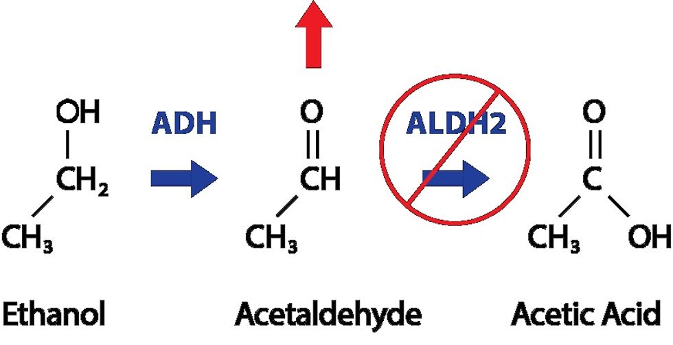 There are two enzymes responsible for metabolizing alcohol: Alcohol dehydrogenas and acetaldehyde dehydrogenase (ALDH2). The first enzyme; Alcohol dehydrogenas turns the alcohol into acetaldehyde which is a toxic substance. Then the second enzyme; Acetaldehyde dehydrogenase (ALDH2) processes the acetaldehyde to turn it from a toxic substance into a harmless substance called acetate. BUT for people with the 'Asian Flush Syndrome' they break down alcohol 100 times faster than a normal person, and they lack the second enzyme acetaldehyde dehydrogenase(ALDH2) which is supposed to turn the acetaldehyde into acetate. This then causes blood vessels to dilate and our faces to turn red because of the build-up of acetaldehyde in our bodies. So instead of breaking down alcohol to be harmless, it leaves all the toxins in our bodies longer causing unpleasant side effects. If you're still confused don't worry, I was too when I first started reading into this. So here's a chart to hopefully make it easier to understand: