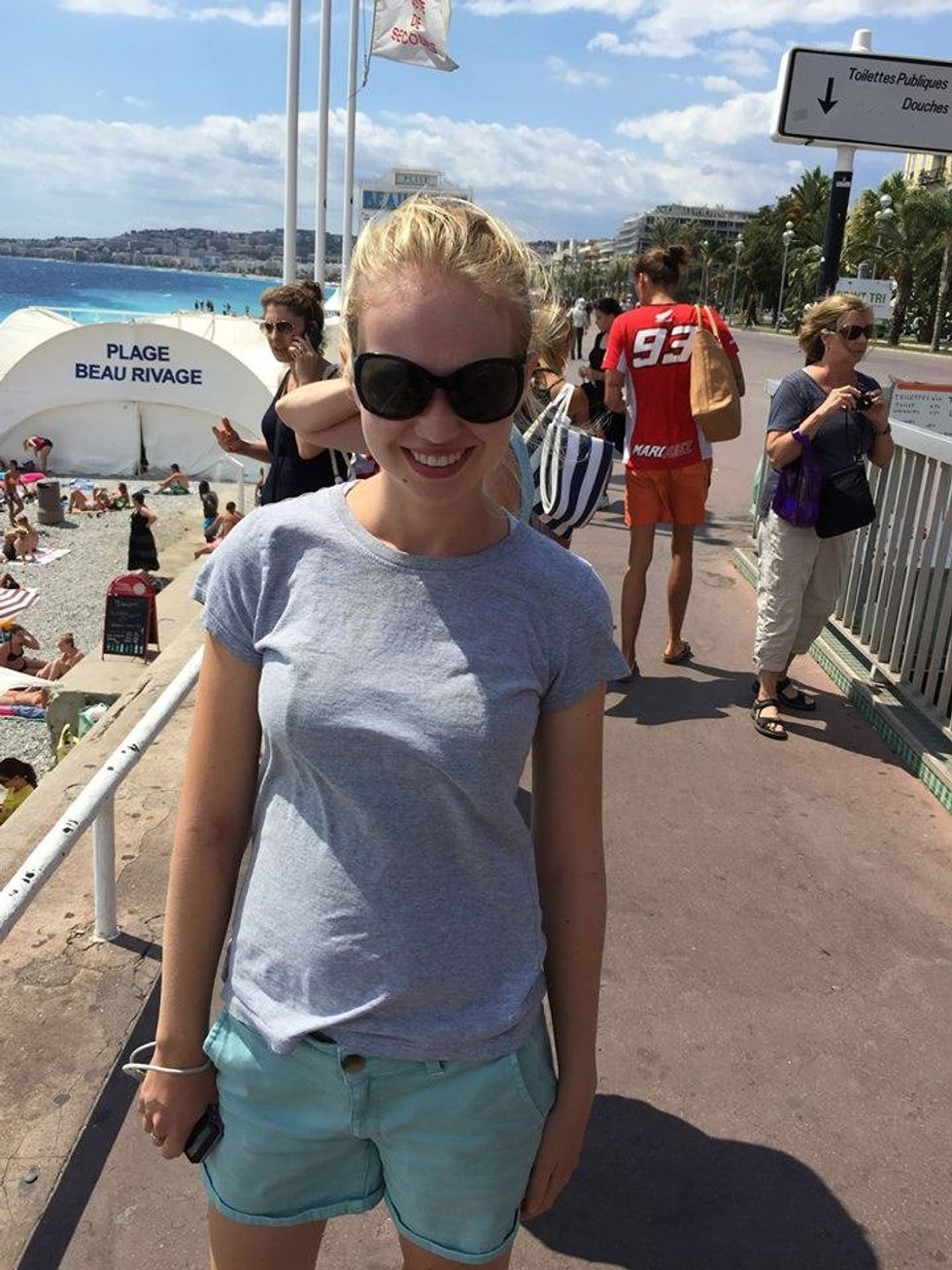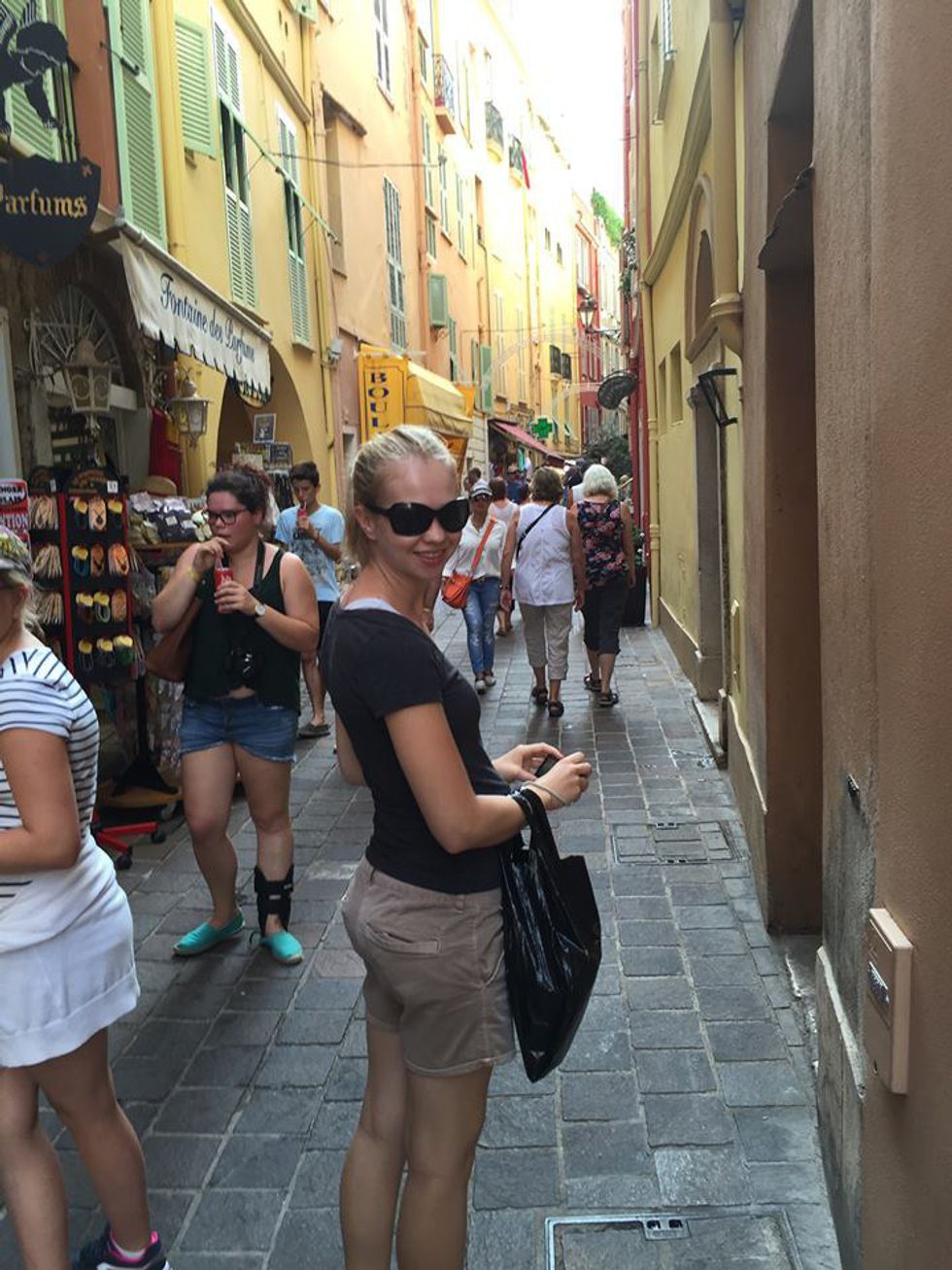 This is me in a little marketplace in Menton. This is how the streets in France look like usually. Most streets are barely big enough for a small car to fit through. A lot of the market streets -like the one in the picture- have no cars allowed to drive down it. This is a perfect example of a typical street in Southern France.