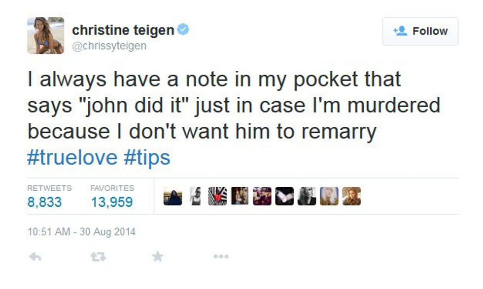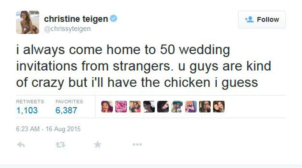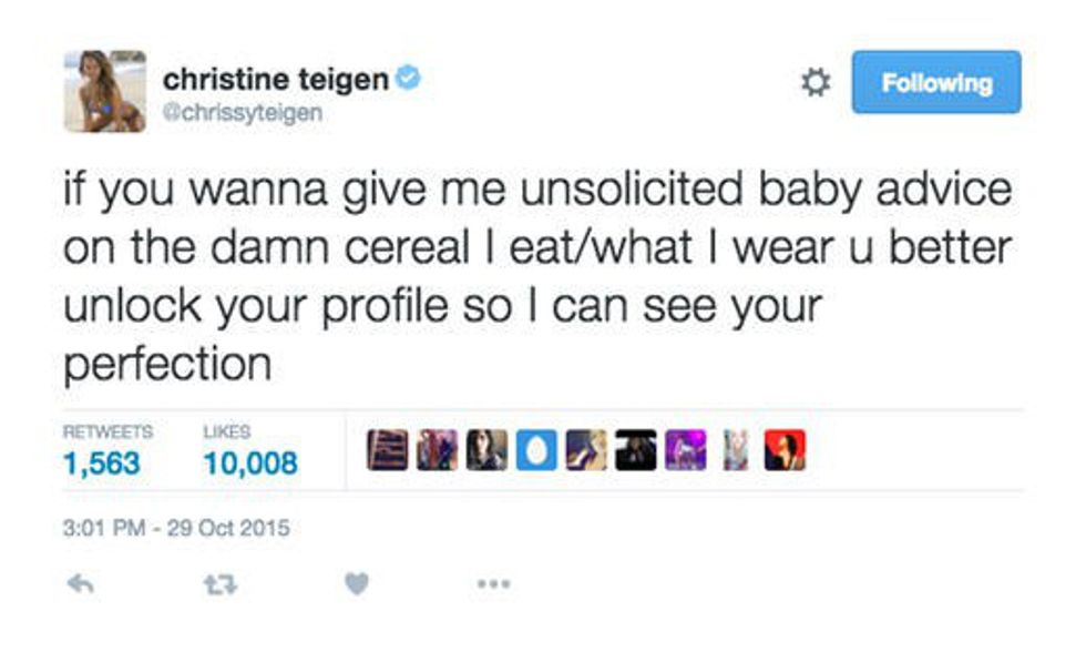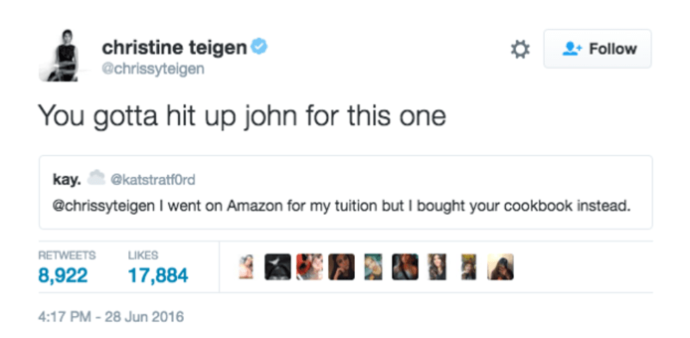 Honestly, Chrissy Teigen is one of the most relatable celebrities in Hollywood. Her marriage with John Legend is high-key goals. Even after they had beautiful baby Luna, they never forget to care for each other too. Chrissy is also blunt and truthful on social media which is one of the reasons I love following her on my own social media accounts. She takes the time to respond to fans and make us laugh. Here are some perfect examples of Chrissy doing what she does best on Twitter