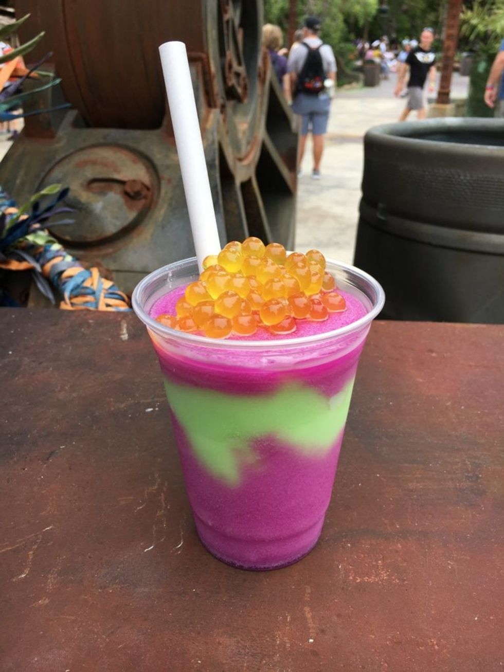 And last, but certainly not least on our list is this beautifully layered frozen drink inspired by Avatar. Found at the Pongu Pongu Lounge in Pandora in Animal Kingdom, this sweet drink is a mix apple and desert pear limeade flavored slushy topped with passion fruit boba balls.