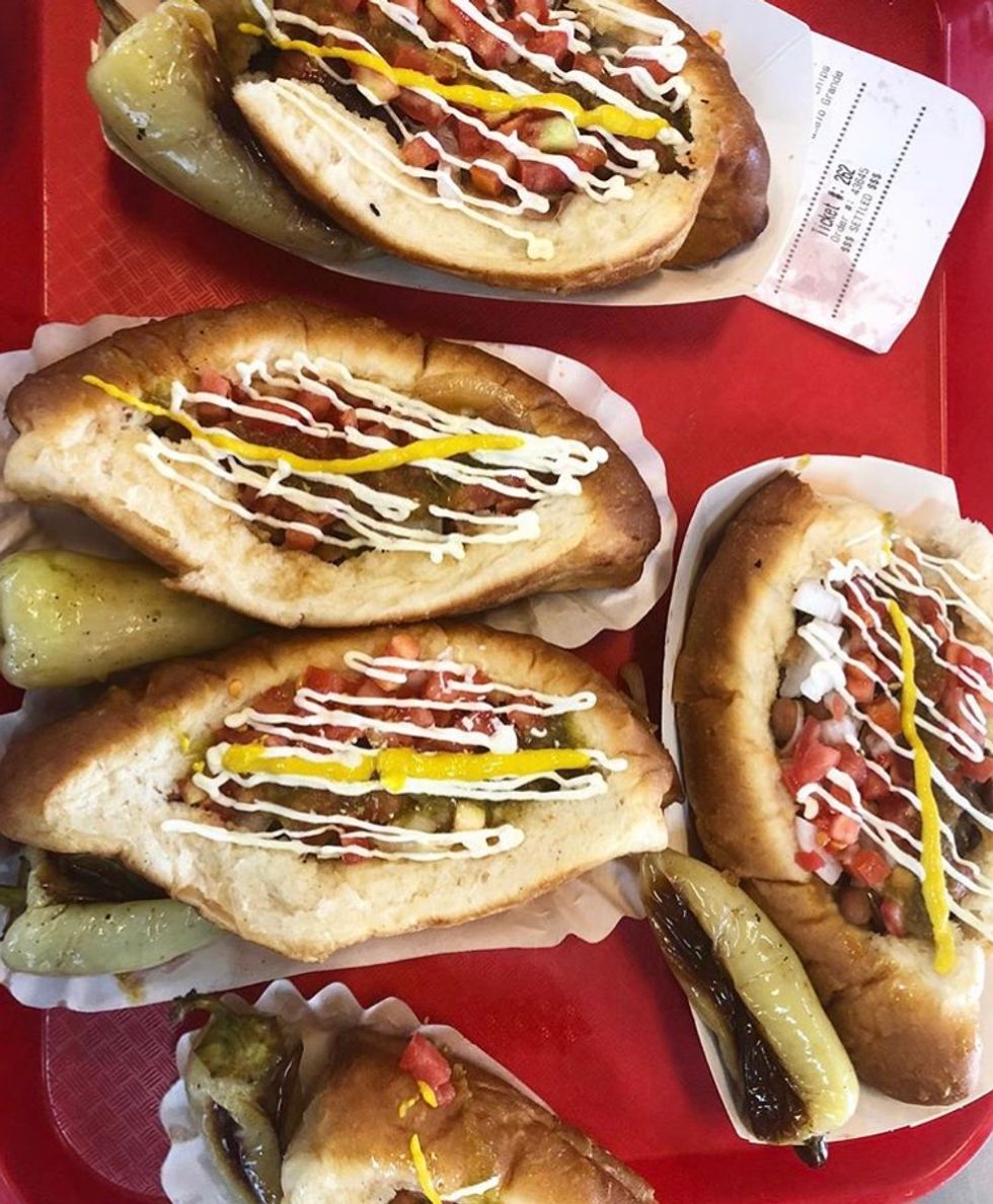 Whenever my girlfriend first told me about these, I was a little skeptical because I don't care for hot dogs too much. These changed my life, though. I don't even know what the bun is, but it's super fluffy, and I could eat it just by itself. So it's a hot dog that's wrapped in bacon and topped with beans, tomatoes, onions, relish, mustard, and mayonnaise. It sounds a little strange, but I promise it'll make a typical hot dog look as boring as history class.