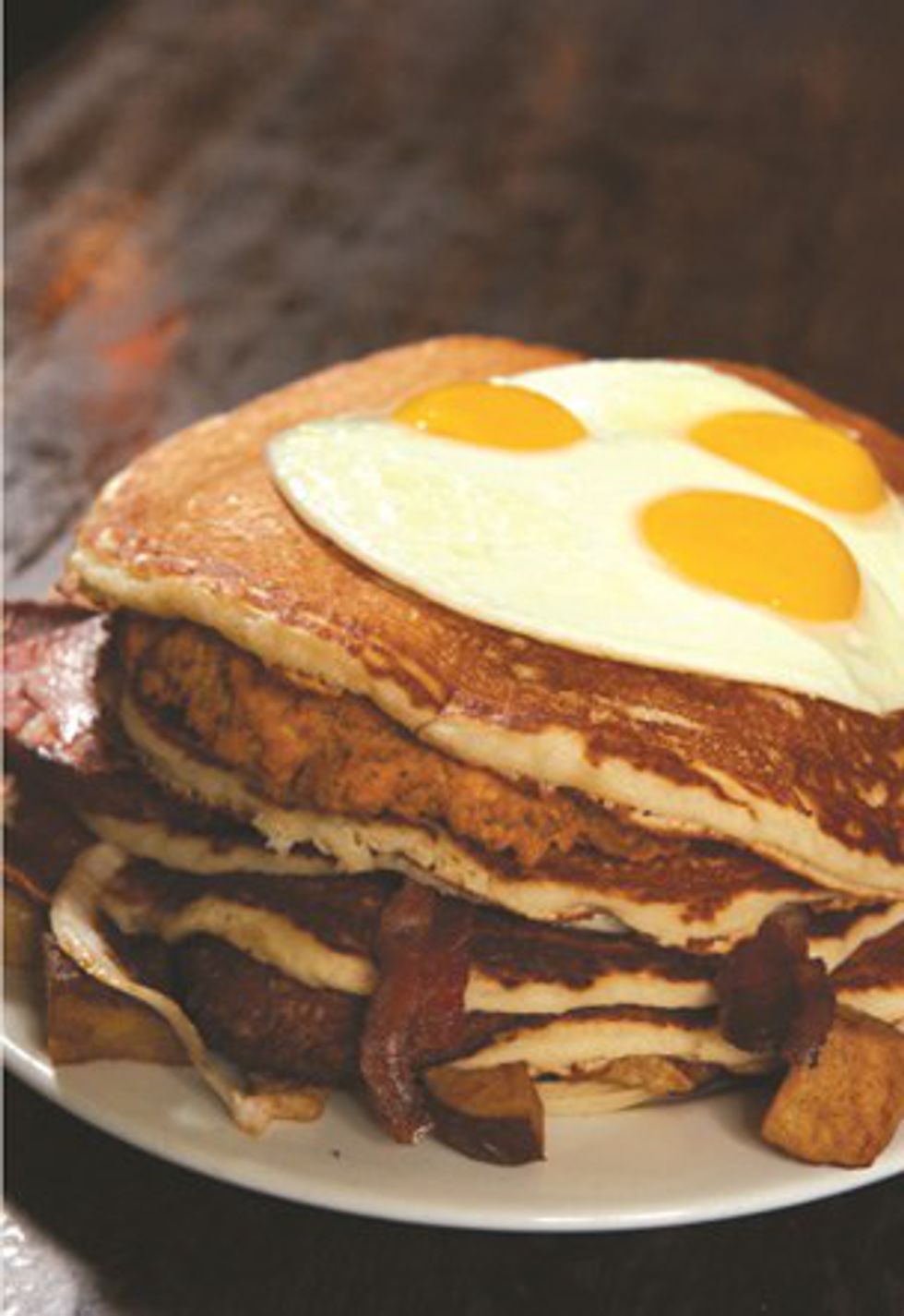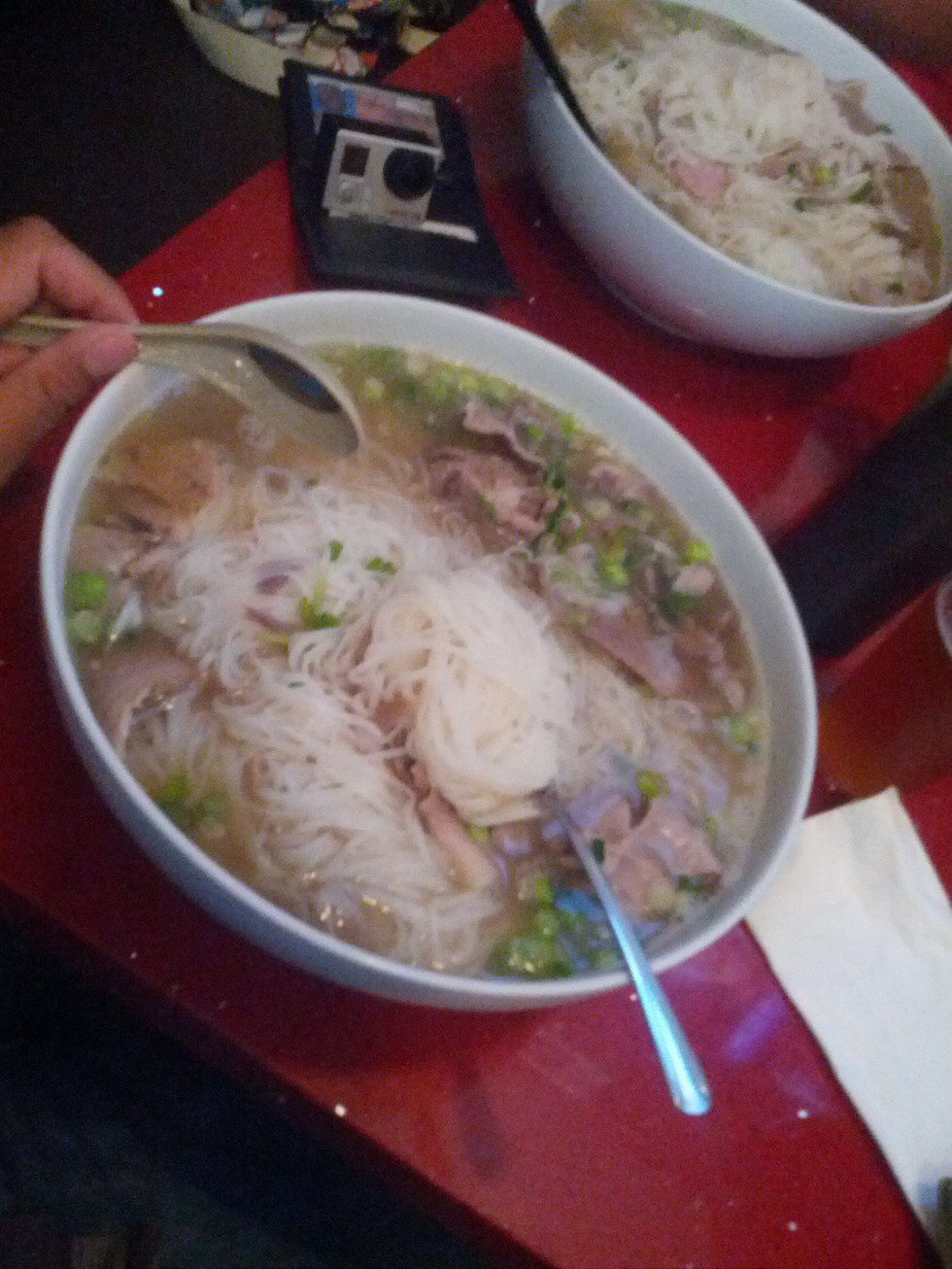 Five buttermilk pancakes layered with four strips of bacon, two sausage patties, an eight-ounce ham steak and an eight-ounce country fried steak, topped with three eggs any style, all on a bed of home fries. If you can finish it by yourself in under an hour, it’s on the house! Risk: $31.99.OB Noodle House- Pho 20 Challenge